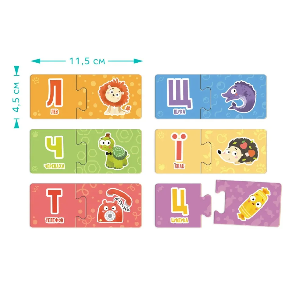 Дітки мають співвіднести дві частинки пазлу одного кольору, одна половинка якого містить літеру, на яку починається слово зображеного на іншій половинці предмета чи тваринки.
