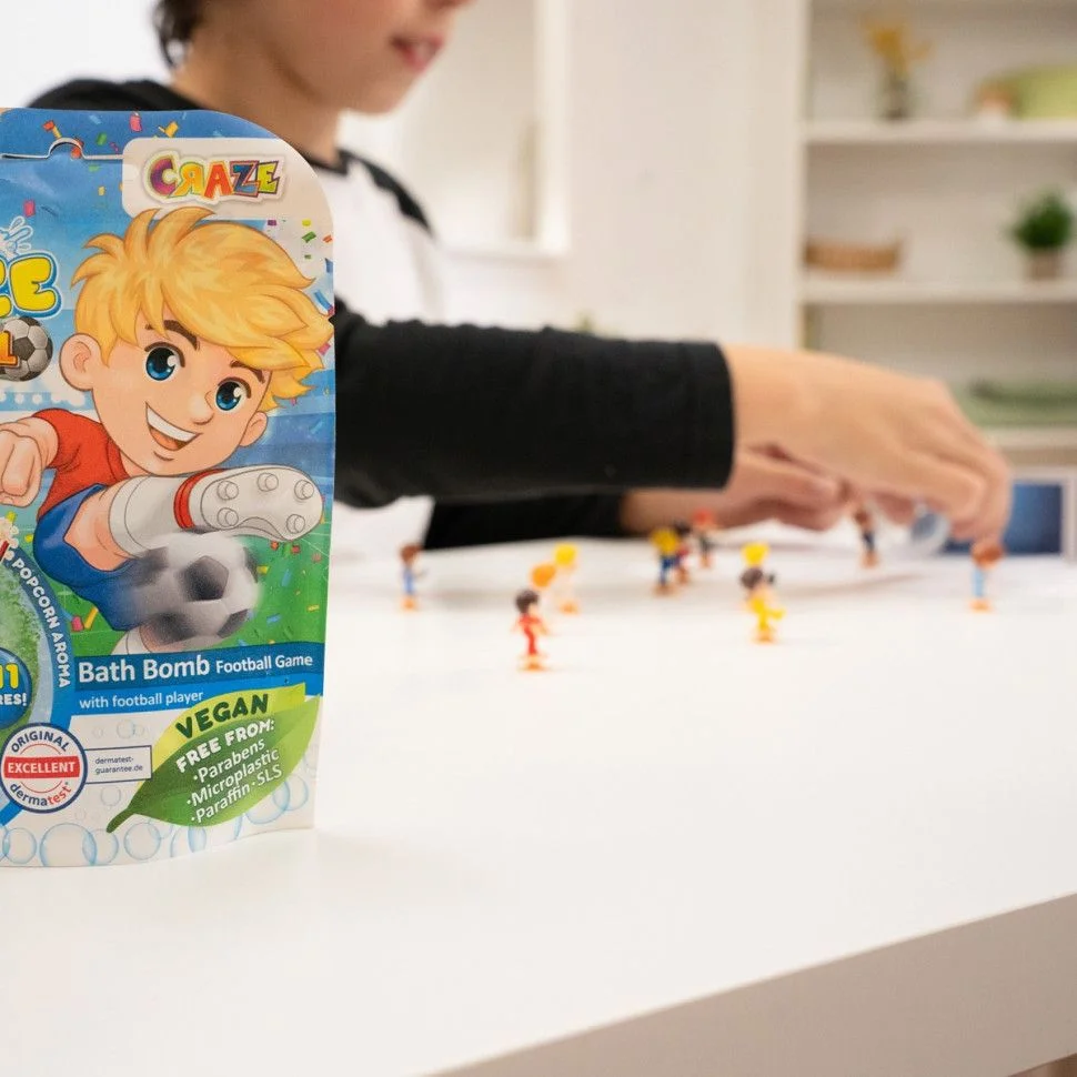Ароматна бомбочка розчиняється і перетворюється в барвисту піну всередині якої ви знайдете іграшку-сюрприз: колекційну фігурку Футболіста!