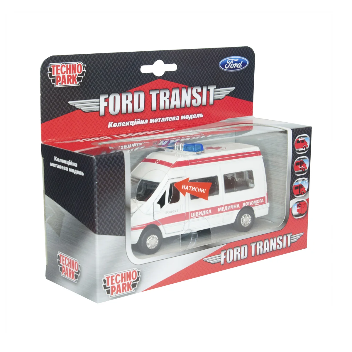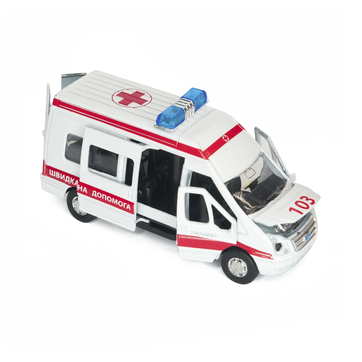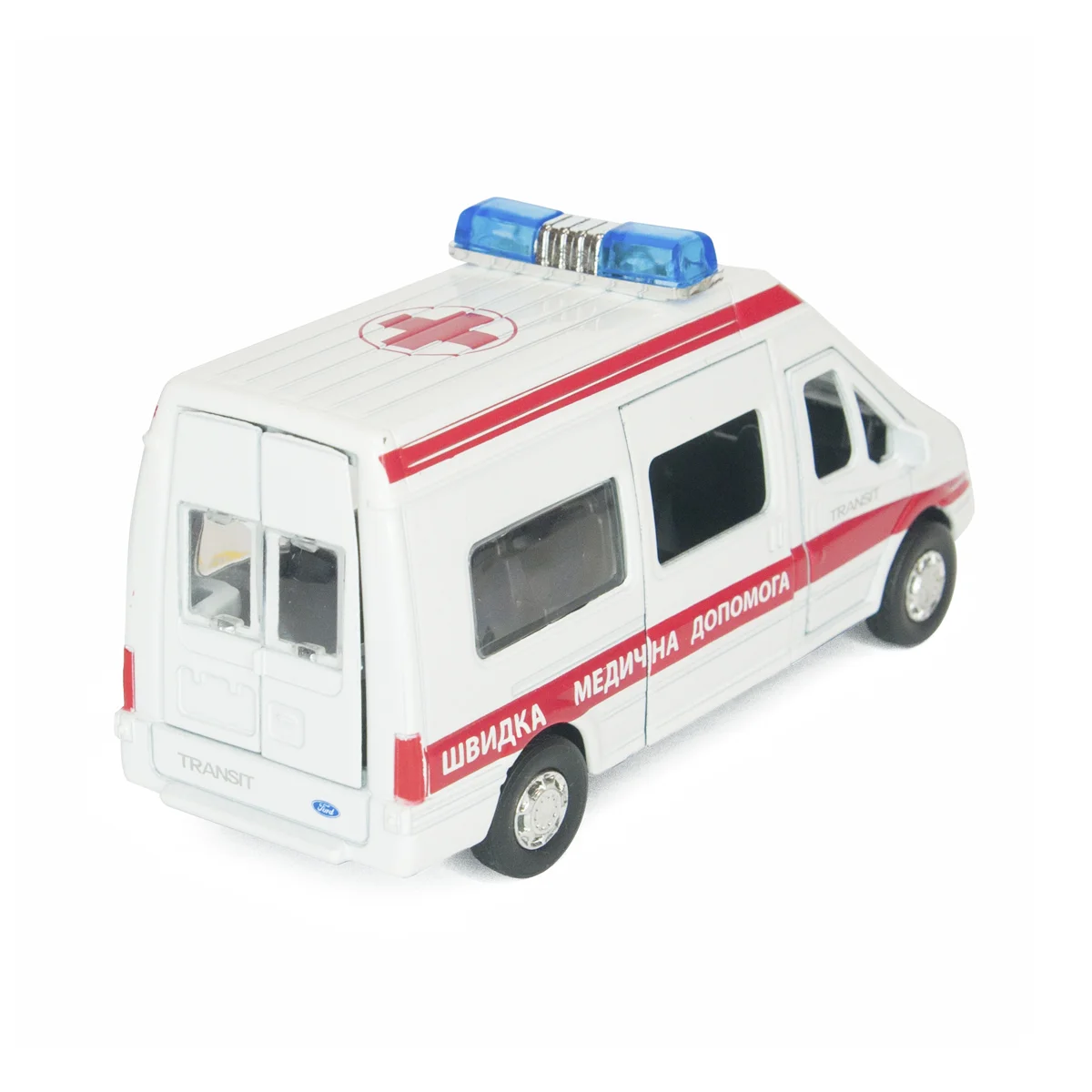 Озвучена українською мовою, реалістична металева машинка реанімаційний автомобіль Ford Transit оснащена інерційним механізмом, що дозволяє їй рухатися "своїм ходом".