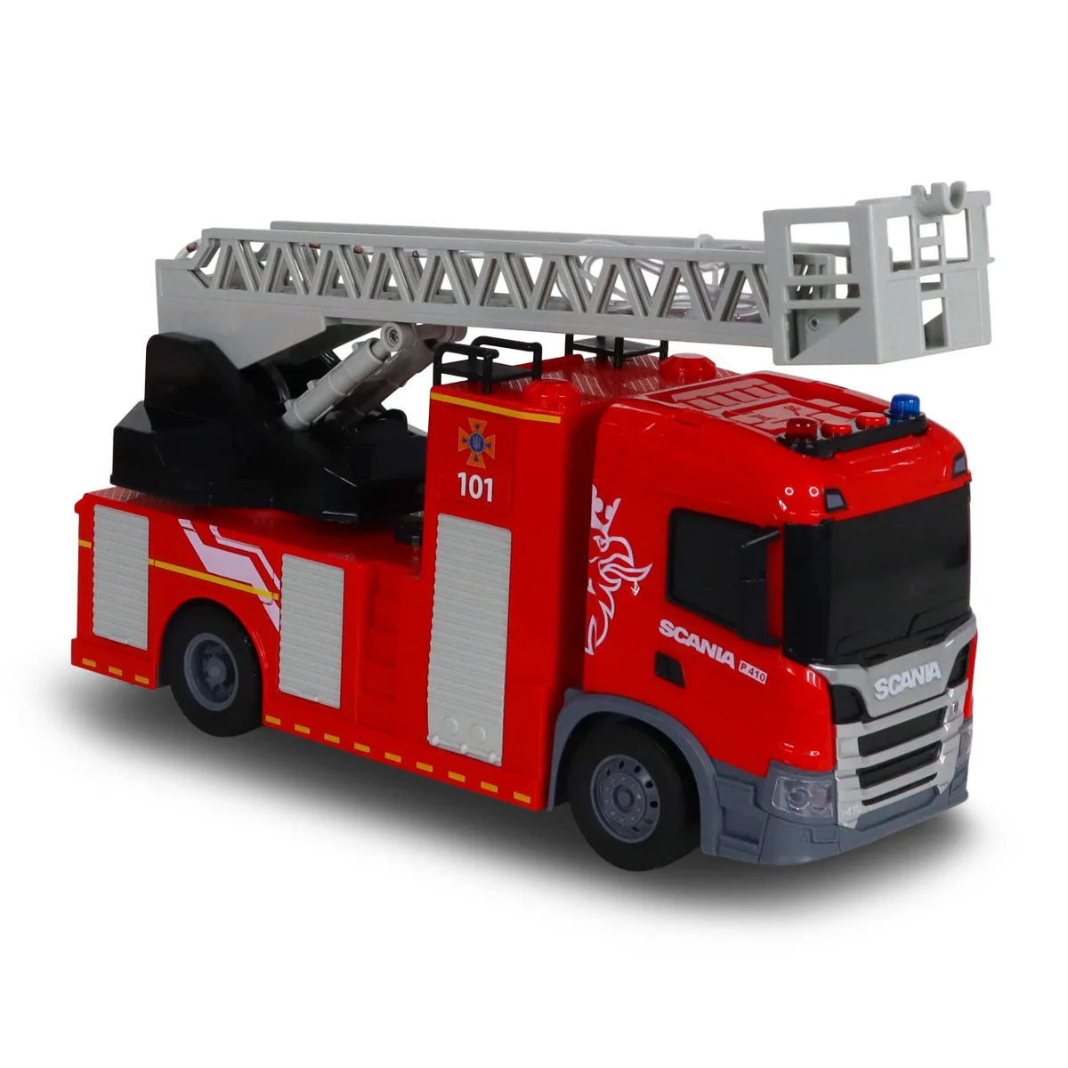 - Пожежна машина має функціональні елементи: поворотну драбину та можливість розбрискування води. Драбина може підійматися, опускатися, подовжується та обертається на 360 градусів. Щоб розпили воду, натисніть кнопку під драбиною і вода почне розбрискуватися з верхньої частини драбини.