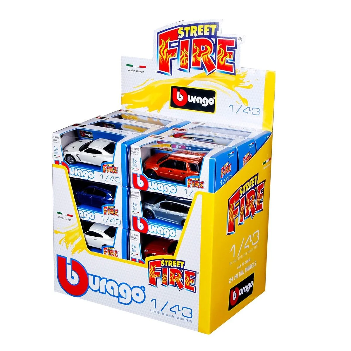 У жовтому диспенсері представлено 24 масштабовані металеві моделі автомобілів серії "Street Fire" 12 (дванадцяти) видів.