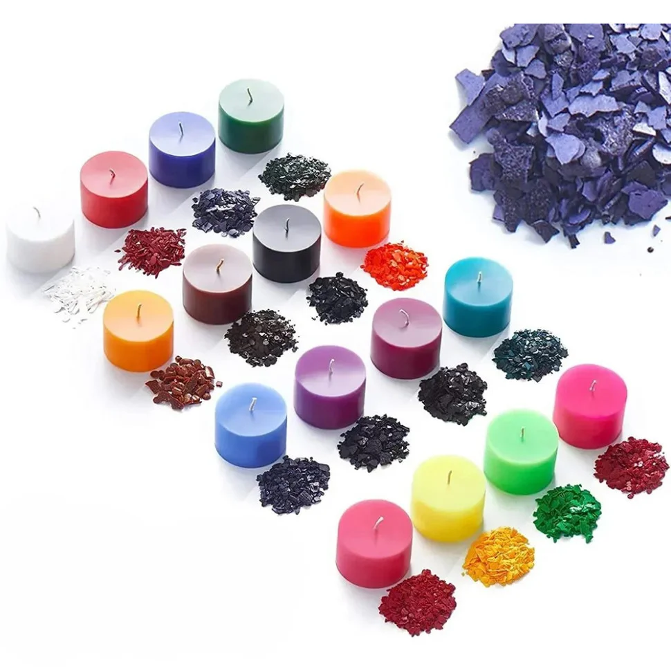 Якщо вам подобається працювати з соєвим воском, то ви, звичайно, знаєте, що його початковий молочно-білий колір при фарбуванні змінюється більш пастельний. Працюючи з парафіном, ви отримаєте свою свічку у більш насиченому варіанті. Можливо, ви також захочете спробувати використати цей барвник із пальмовим воском. Ви будете в захваті від матових візерунків, які створює цей вид воску в готових виробах.