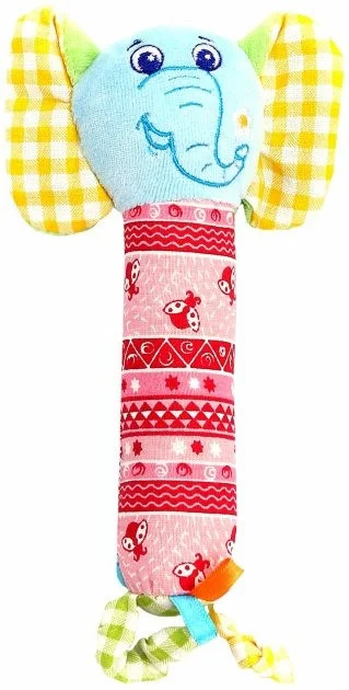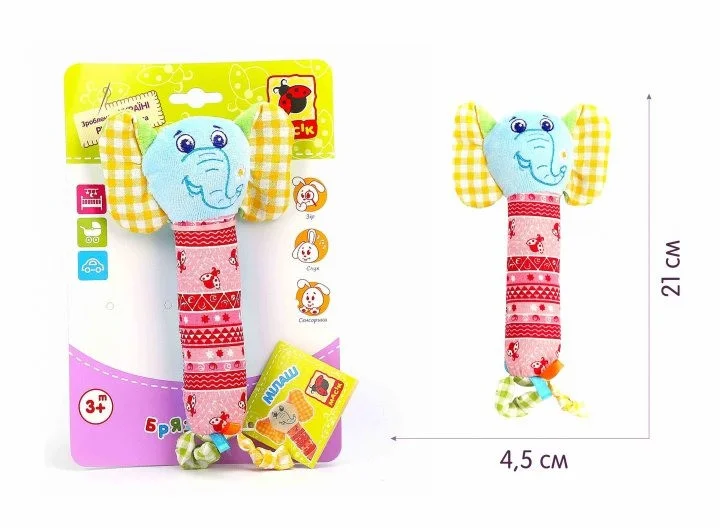Яскрава мордочка, різнокольорові візерунки, вушка, що шелестять, і кумедна пищалка сприяють розвитку концентрації уваги, зорового і слухового сприйняття.