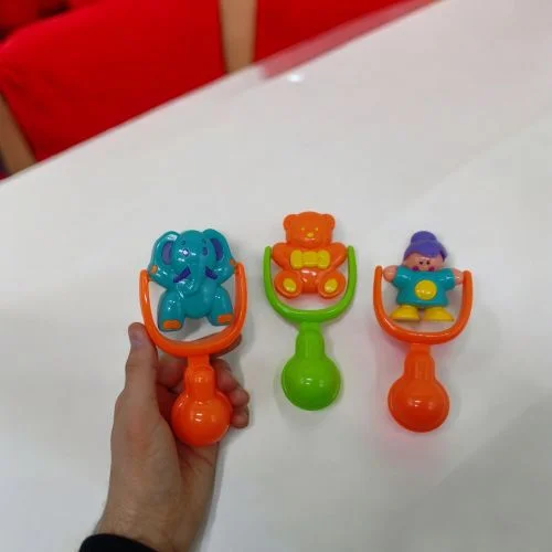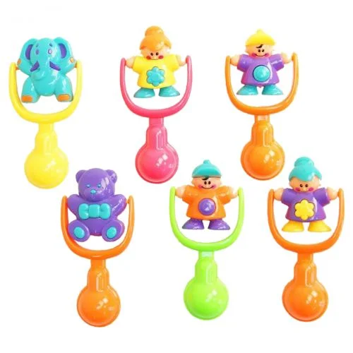 Яскрава пластикова брязкальце. Має ручку, за яку іграшку зручно тримати малюкові. Зверху розміщена фігурка, яку можна крутити і вона буде перевертатися. У ручці розміщено кульку, який торохтить, якщо потрусити іграшку. 6 видів: слоник, ведмедик і чоловічки.