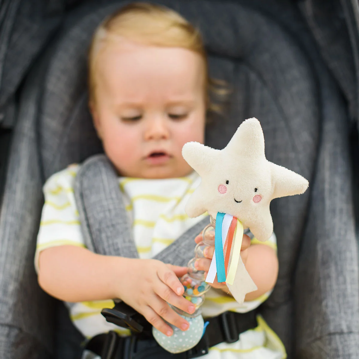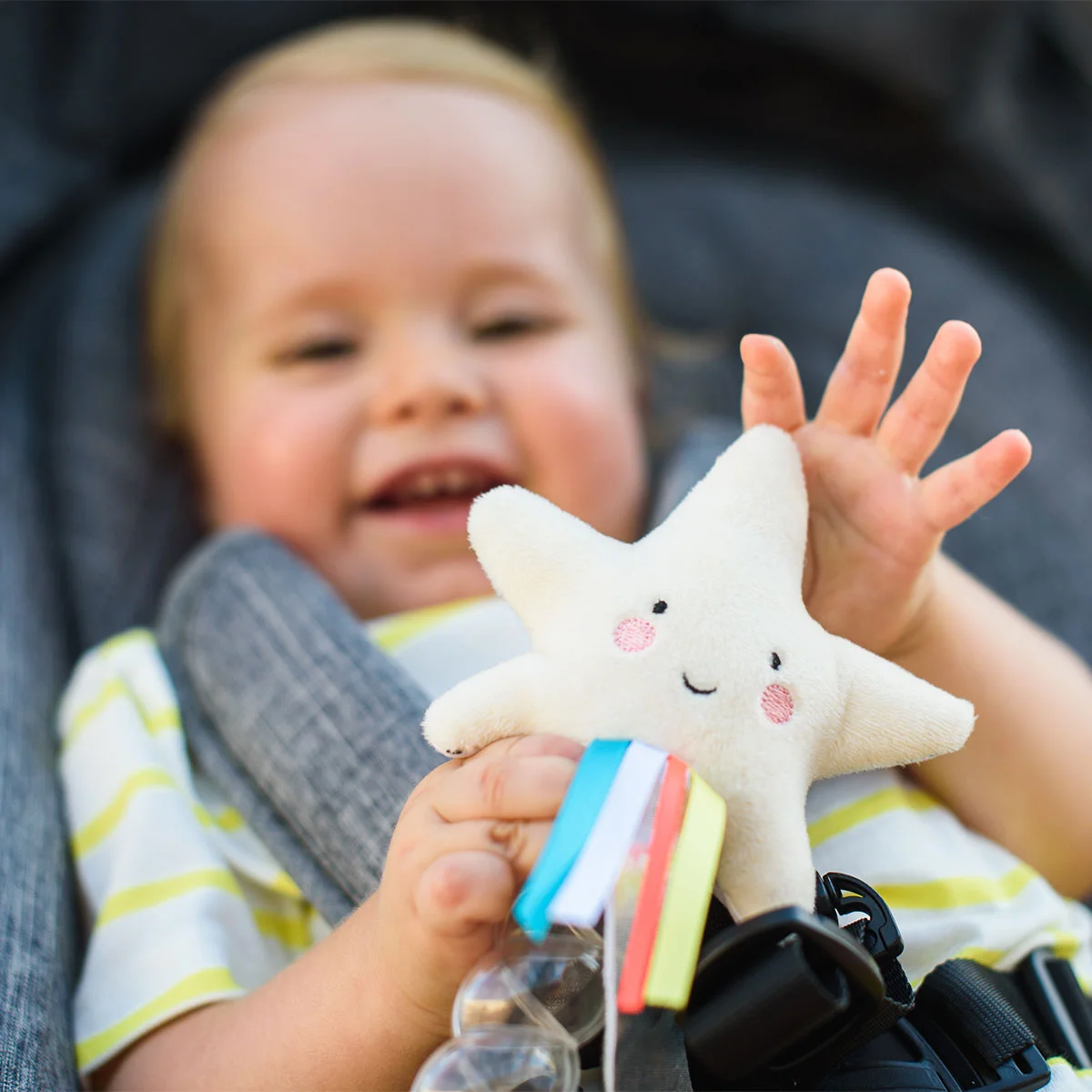 Брязкальце - ЗІРОЧКА - це плюшева зірочка зі зручною ручкою з кульками всередині, за якими малюкові буде так цікаво спостерігати!