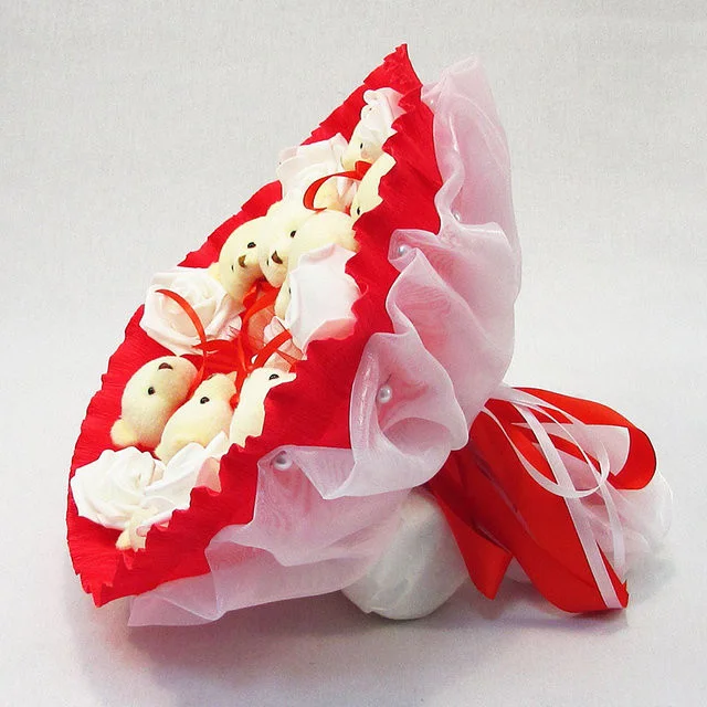 Букет з іграшок Ведмедики 9 червоний зроблений з ведмежат блідо-молочного кольору. Ведмедики симпатичні й забавні, всі з червоними бантиками. Ведмедики розташовані в 2 кола. На папері між ведмедиками і в центрі композиції знаходяться білі штучні (не живі!) троянди, зроблені з латексу (як на весільних букетах). Зовні композиція оформлена в червоно-білому кольорі. Ручка букета перев'язана атласними стрічками.