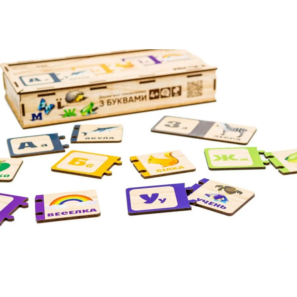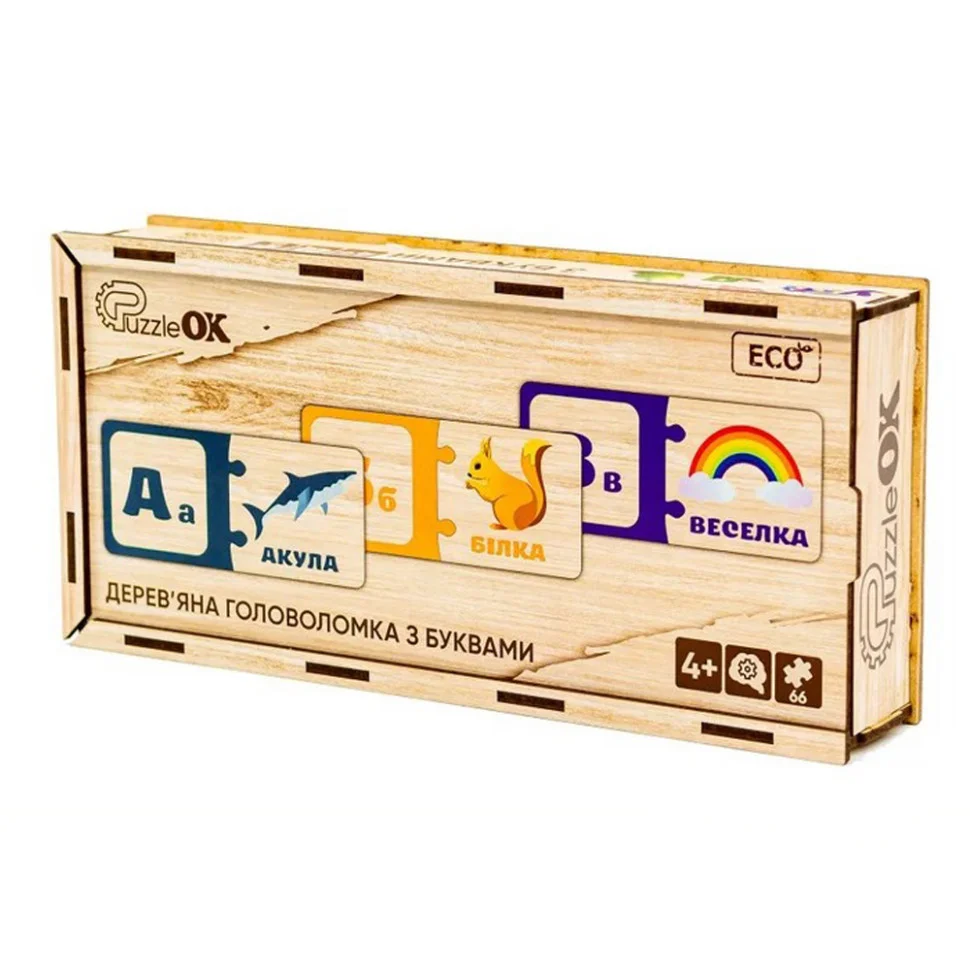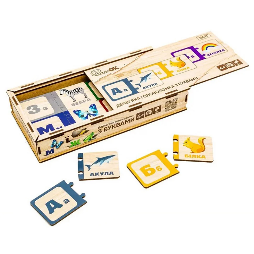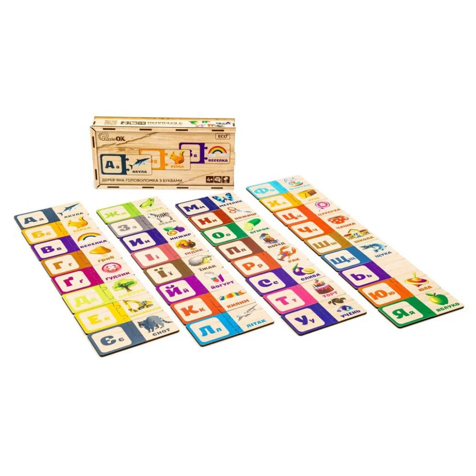Дерев'яна розвиваюча іграшка-головоломка, яка допомагає малюкам швидко вивчити букви українського алфавіту. Ігрова форма навчання дозволяє використовувати головоломку для дітей у віці від 4 років.