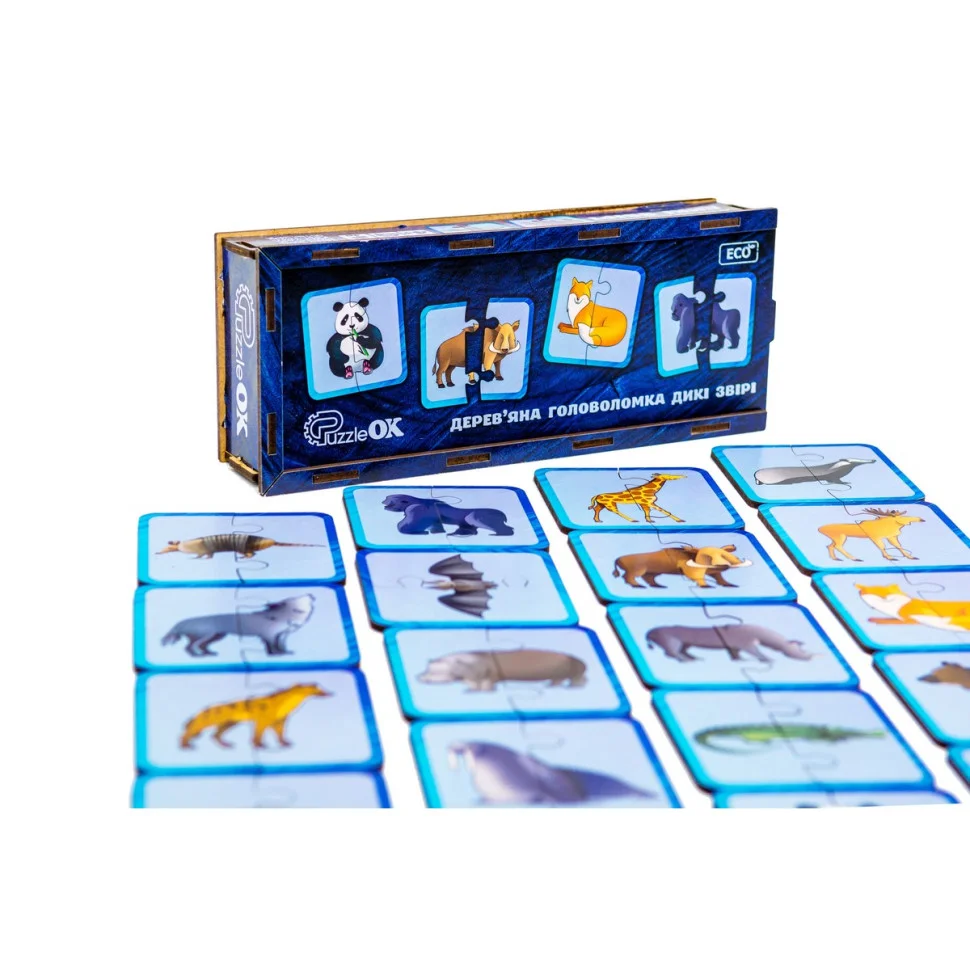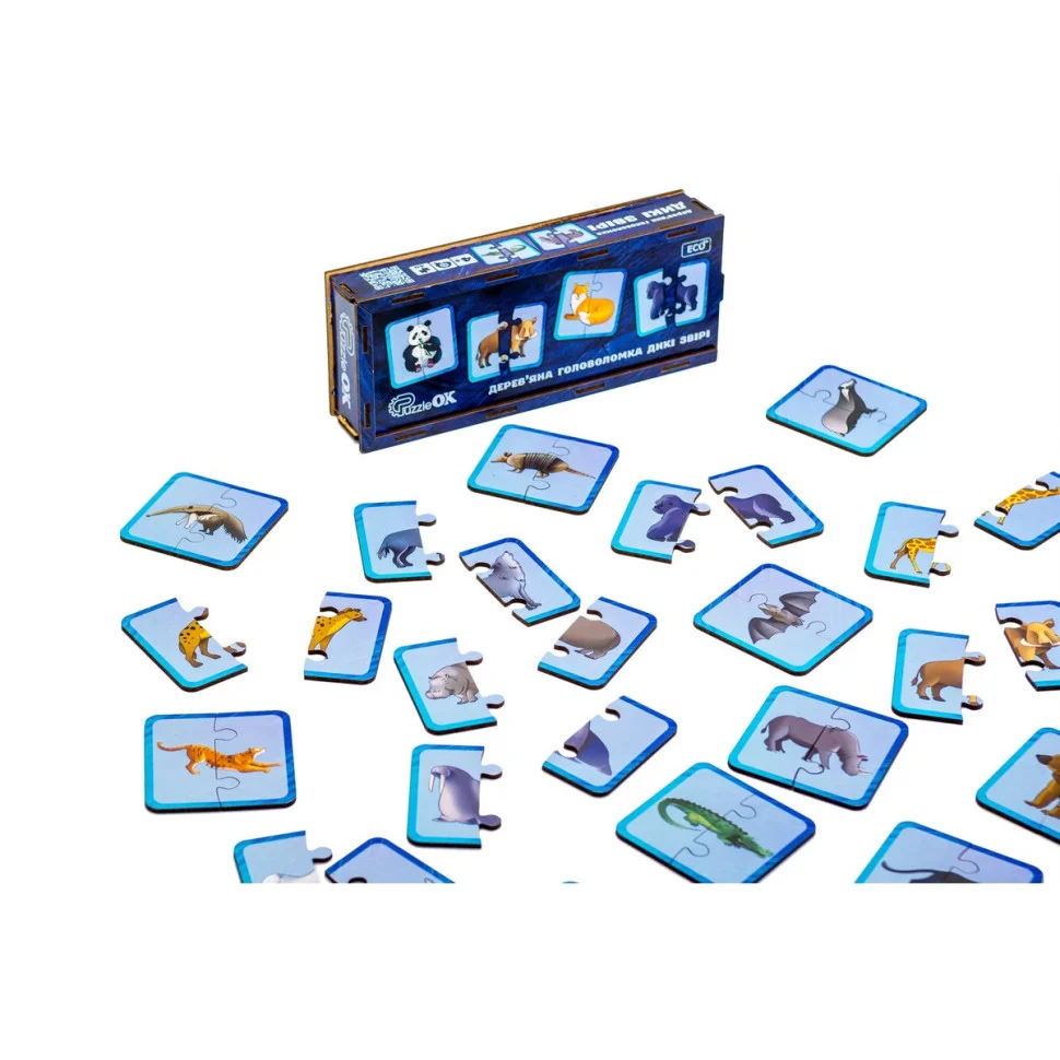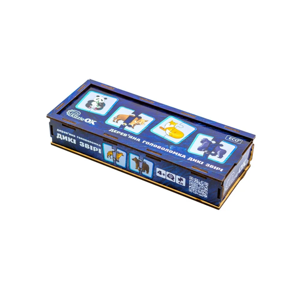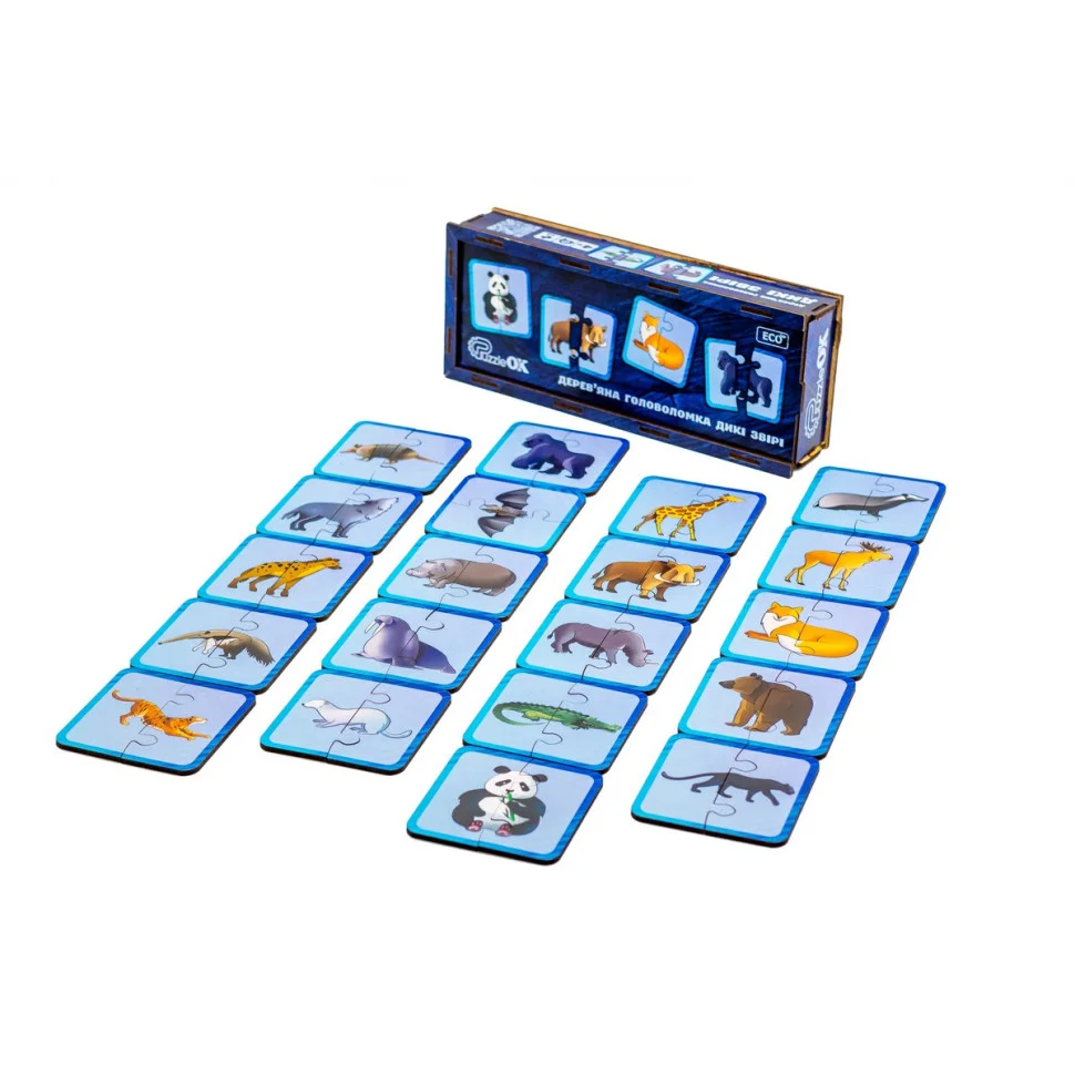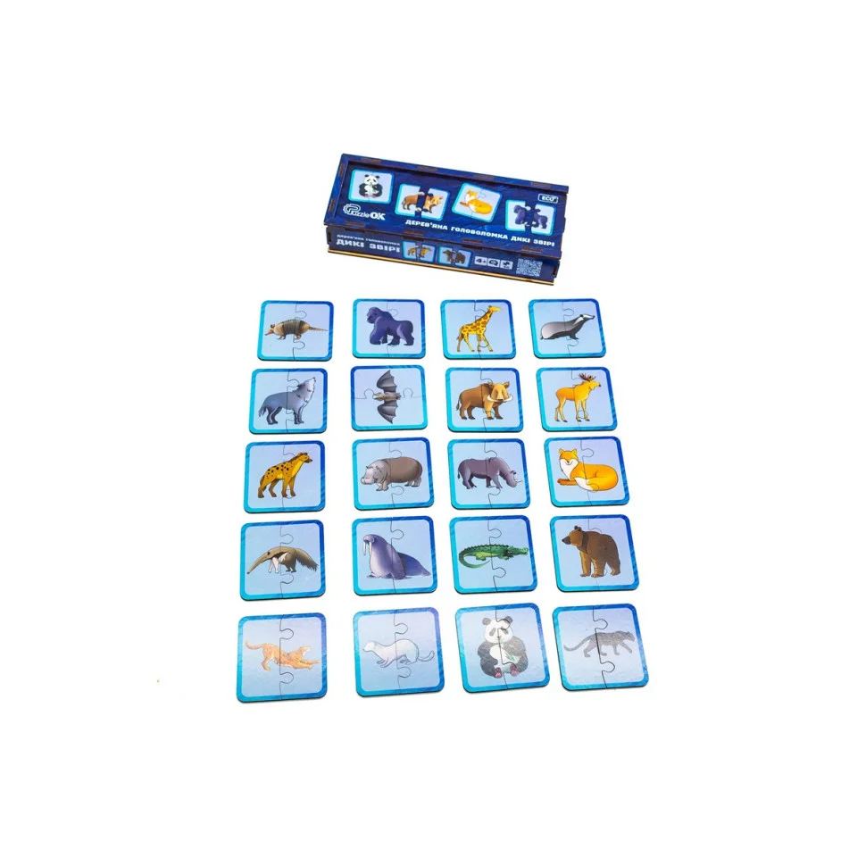 Дерев'яна розвиваюча іграшка "Дикі тварини" з зображеннями різноманітних диких звірів рекомендується для діток у віці від 3 років. Головоломка виготовлена з натурального та безпечного матеріалу - тонкої деревноволокнистої плити, пресованої без додавання шкідливих домішок, стійка до стирання та безпечна для здоров'я малюків. Гра передбачає складання зображень диких звірів з елементів, пластинки поєднуються за принципом пазла. Сприяє розвитку дрібної моторики. Привабливі картинки на блакитному фоні зацікавлять малюка. До комплекту входять 40 пластин та коробка для їх зберігання.