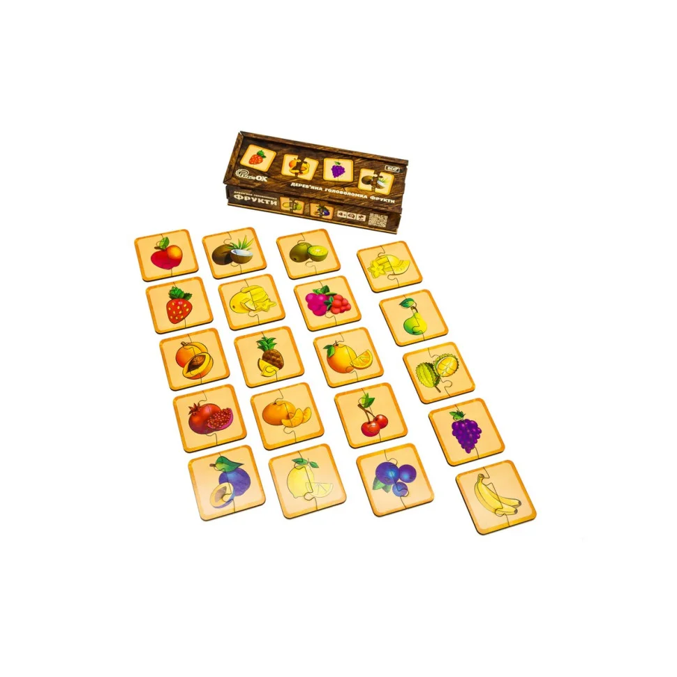 Дерев'яна розвиваюча іграшка із зображеннями різноманітних фруктів рекомендується для дітей у віці від 3 років. Виготовлена з натурального дерева. До комплекту входить 40 пластин, кожна з яких розділяється на 2 частини. На пластинах зображені фрукти, малюнки яскраві та максимально реалістичні. Малюки легко впізнають знайомі їм фрукти та складуть пазл. Іграшка сприяє розвитку дрібної моторики та надовго захопить увагу вашої дитини.