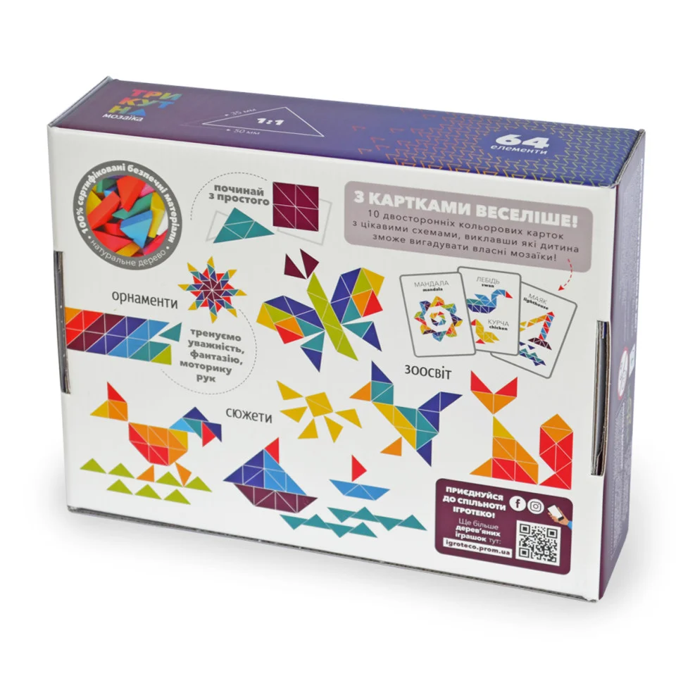 Оригінальна дерев'яна мозаїка від ТМ Kupik складається з 64-х різнокольорових елементів трикутної форми, з яких можна викладати стилізовані зображення тварин, рослин, предметів побуту, цифри і букви, геометричні форми, орнаменти та безконечники.