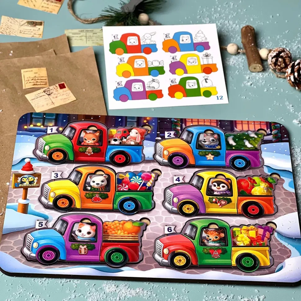 Завдання дитини: зібрати усі машинки так, як на картці-завданні. Усі деталі взаємозамінні, тому можна пофантазувати і зібрати так, як малюк сам собі придумав та уявив.