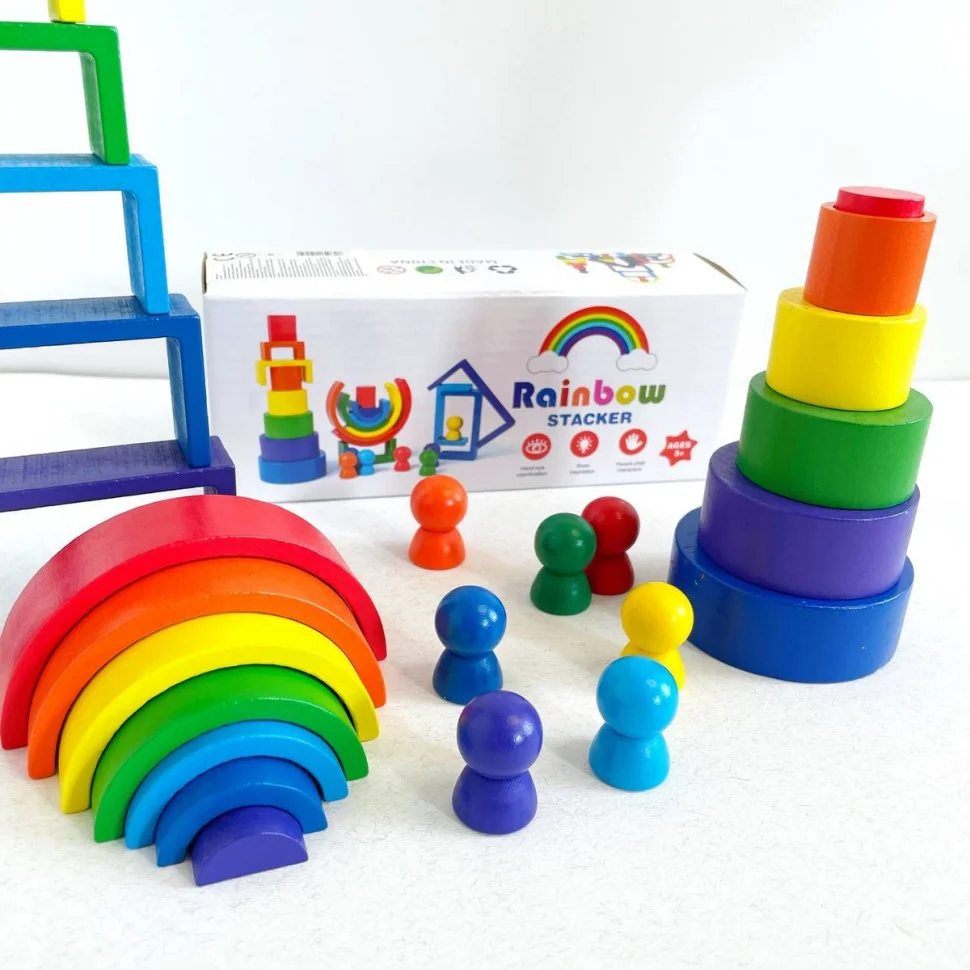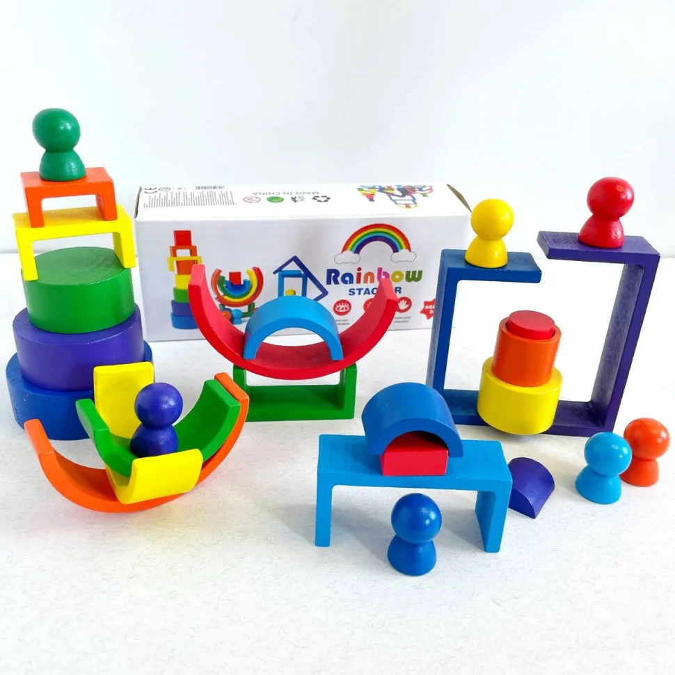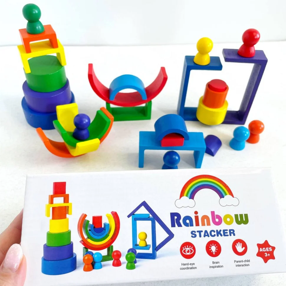 Ця дерев’яна іграшка включає різноманітні елементи, такі як дуги, прямокутники, круги та фігурки, що дозволяє створювати безліч конструкцій і моделей. Кожен елемент виконаний у кольорах веселки, що додає грі яскравості і привабливості.