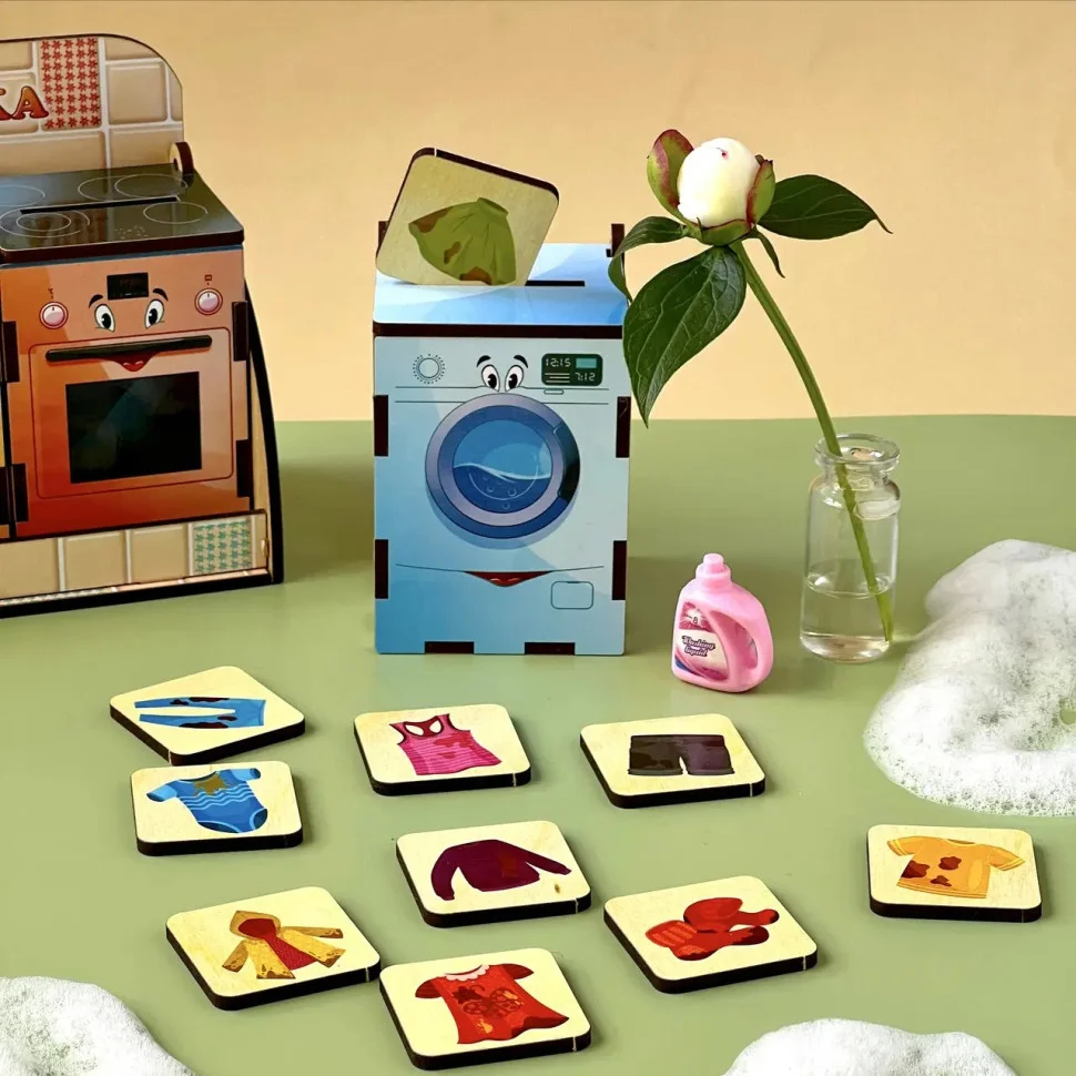 Сортер-комодик призначений для ознайомлення дитини з функціями побутової техніки. У наборі йдуть 40 плашок із зображенням: брудного посуду і речей, продуктів харчування та кухонного посуду, які малюкові необхідно правильно відсортувати в 4 тематичних шухлядки-техніки.
