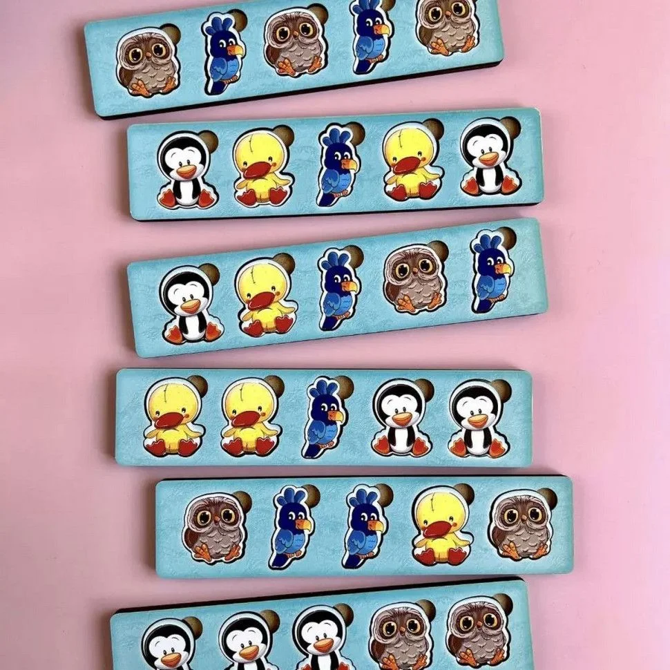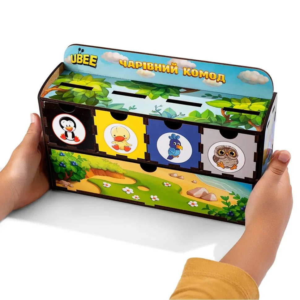 Комод складається з 4 тематичних шухлядок для сортування вкладишів за кольором, малюнком і 1 шухлядки, де знаходяться планки для вкладання. У наборі 6 планок і 30 фігур птахів для сортування.