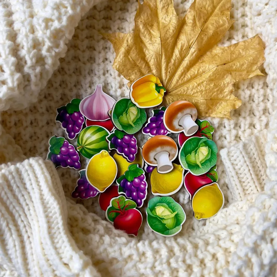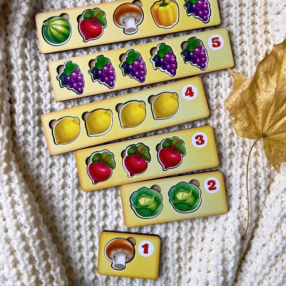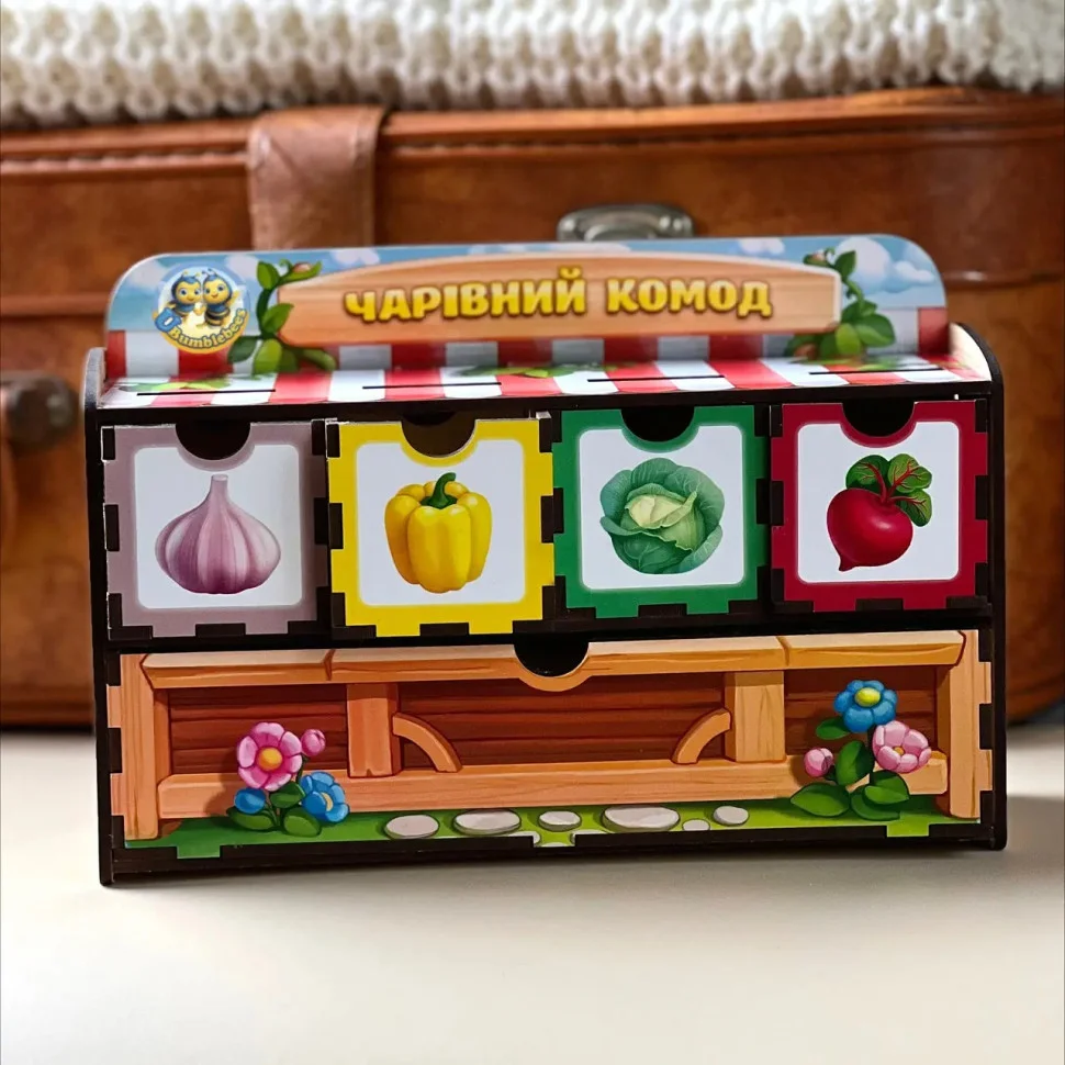 Сортер-комодик призначений для навчання дитини рахунку і кольорам. У наборі йдуть 7 планок з різною кількістю вкладишів овочів і фруктів (перець, буряк, часник, капуста, лимон, виноград, кавун і гриб), які малюкові необхідно правильно відсортувати в 4 двосторонніх шухлядки (малюнок з двох сторін) за кольором і тематичним зображенням.