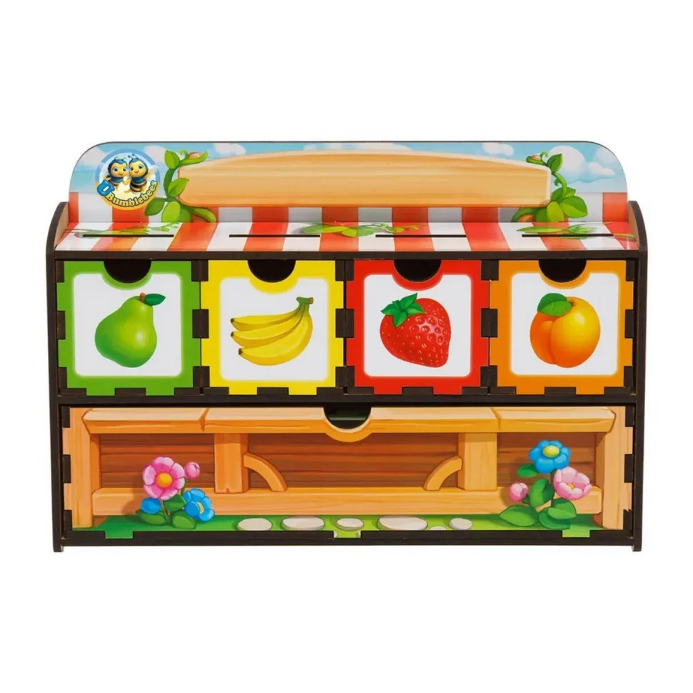Сортер-комодик призначений для навчання дитини рахунку і кольорам. У наборі йдуть 7 планок з різною кількістю вкладишів овочів і фруктів (банан, абрикос, груша, полуниця, гарбуз, огірок, помідор, кукурудза), які малюкові необхідно правильно відсортувати в 4 двосторонніх шухлядки (малюнок з двох сторін) за кольором і тематичним зображенням.