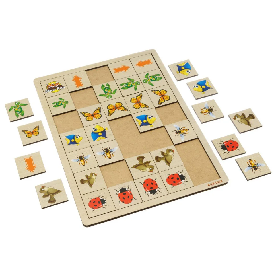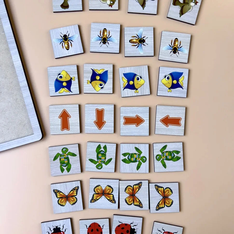 Планшет-основа, на якому розміщені: 6 плашок зі схематичними зображеннями предметів, 4 плашки зі стрілками, 24 плашки для сортування. Всі плашки взаємозамінні, а значить, кожен раз можна міняти завдання.