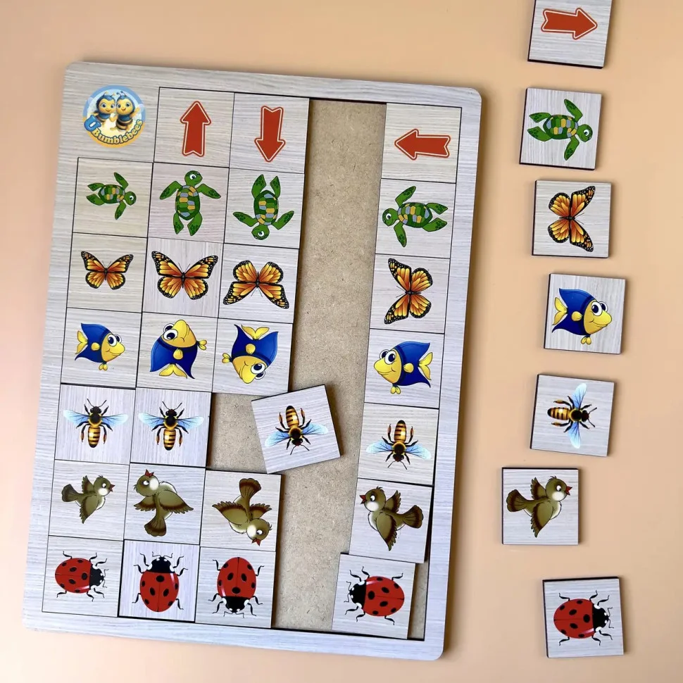 Дитині необхідно розташувати предмет в потрібній графі в зазначеному напрямку (згідно напрямку стрілок). Наприклад, ось так пташка летить вгору, а ось так черепашка пливе направо.