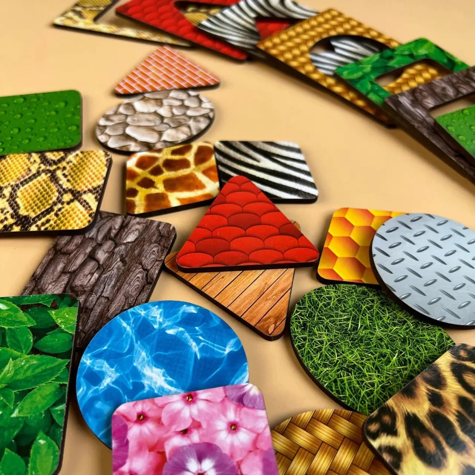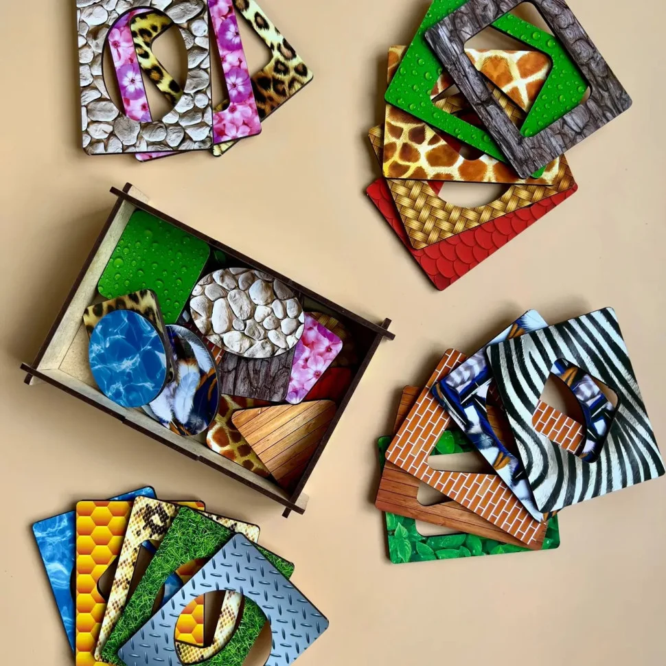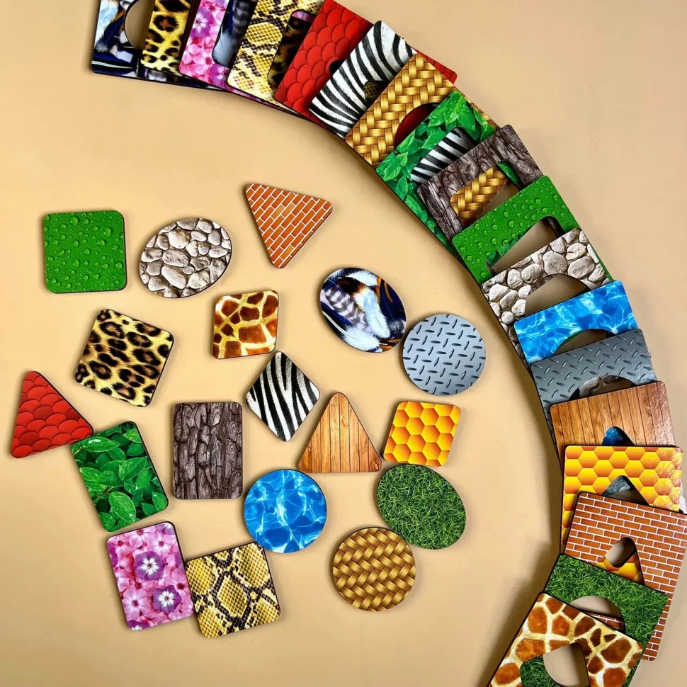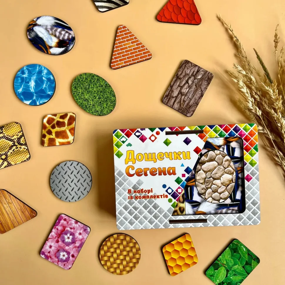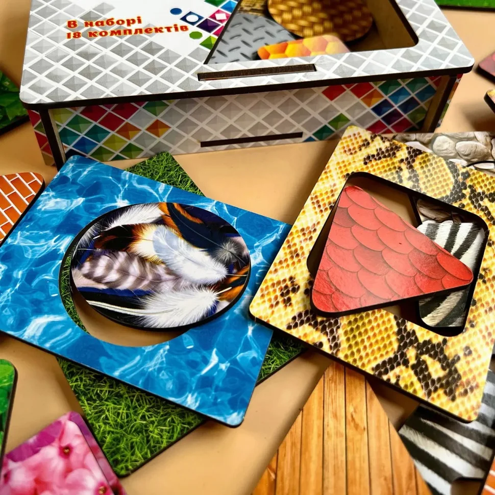 У комплект входить: дерев'яна скринька для зберігання різнокольорових рамок-вкладишів: 1 шт та рамки-вкладиші: 18 шт.