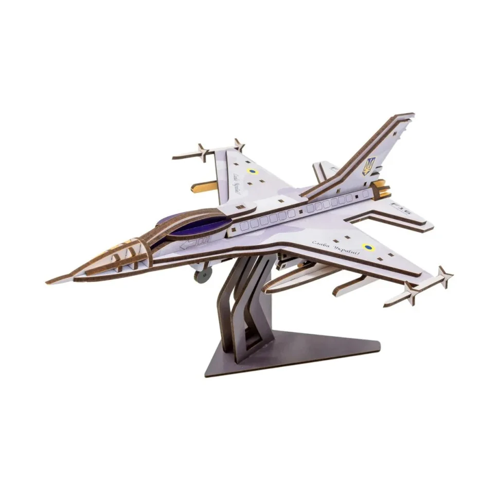 Не потрібно витрачати кошти на дорогий конструктор — тепер ви можете подарувати дитині за прийнятною ціною іграшку вітчизняного виробництва, легку, красиву, виготовлену з безпечних матеріалів — з хвилястої деревної плити, щільної, міцної. Модель багатоцільового одномісного винищувача F-16 — це пазл, який ваш син буде залюбки складати з 79 деталей, сам або з друзями, які також цікавляться сучасною військовою авіацією.
