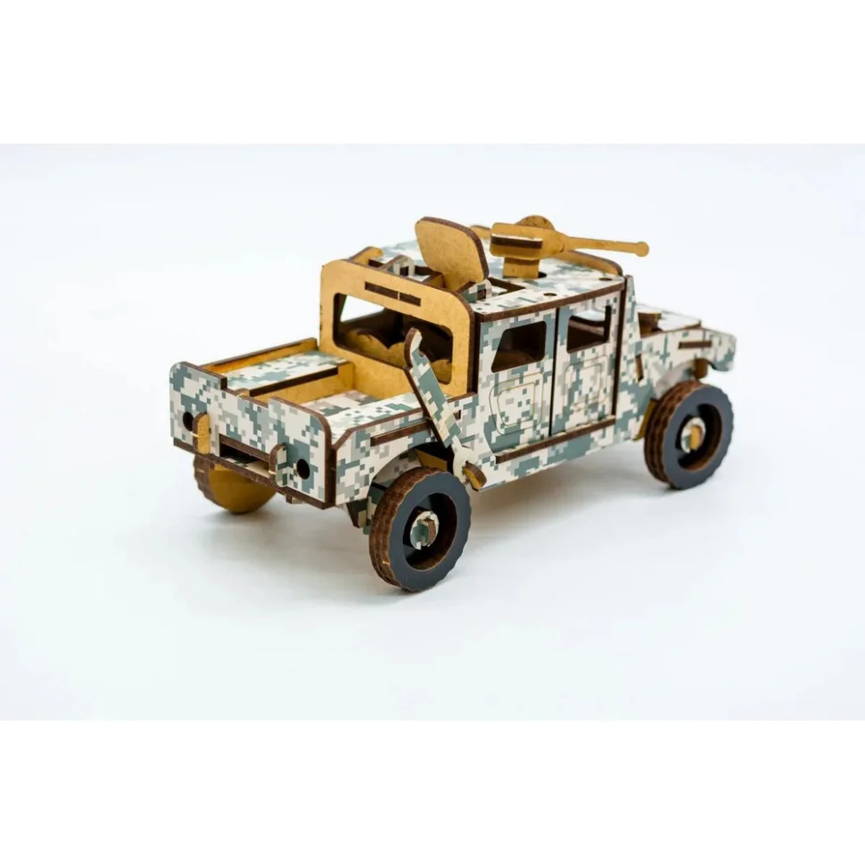 Дерев’яний конструктор ХАМЕР – гарний зразок добре відомого військового автомобіля. Набір складається з 65 деталей. Він буде цікавим для хлопчиків, які захоплюються автомашинами. Заняття по його складанню буде корисним для вашої дитини не тільки вивченням будови машини, але й розвитком дрібної моторики рук. Всі деталі виготовляються з якісної деревини, при нанесенні фарбування використовуються нешкідливі екологічні фарби.