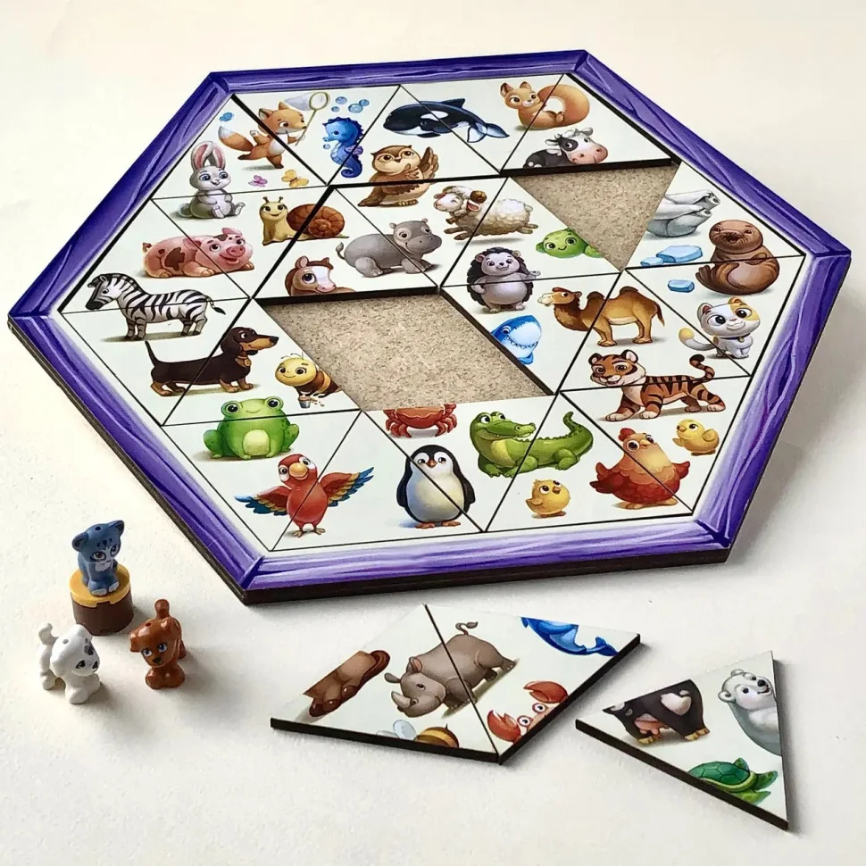 Деталі у вигляді трикутника, а сама основа – це шестикутник. Потрібно зібрати пазл з трикутників. Вивчення що таке "сторони" і "кути" фігур. З трикутників можна складати різні фігури (ромби, трапецію, шестикутник). Можна рахувати тварин, шукати диких і домашніх, водних і сухопутних.
