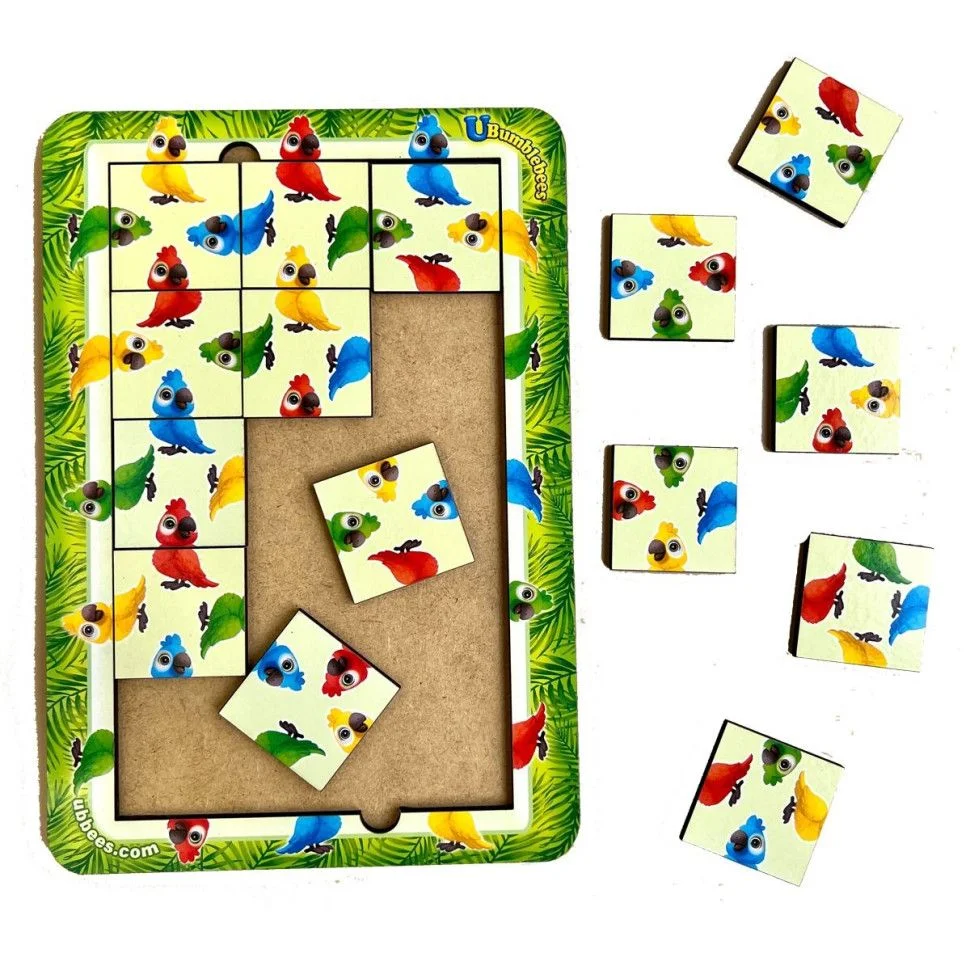 Деталі у вигляді квадратів. Потрібно зібрати пазл з усіх квадратів, на яких намальовані частини різнокольорових папуг. Можна також рахувати папуг та вивчати кольори і напрямки.