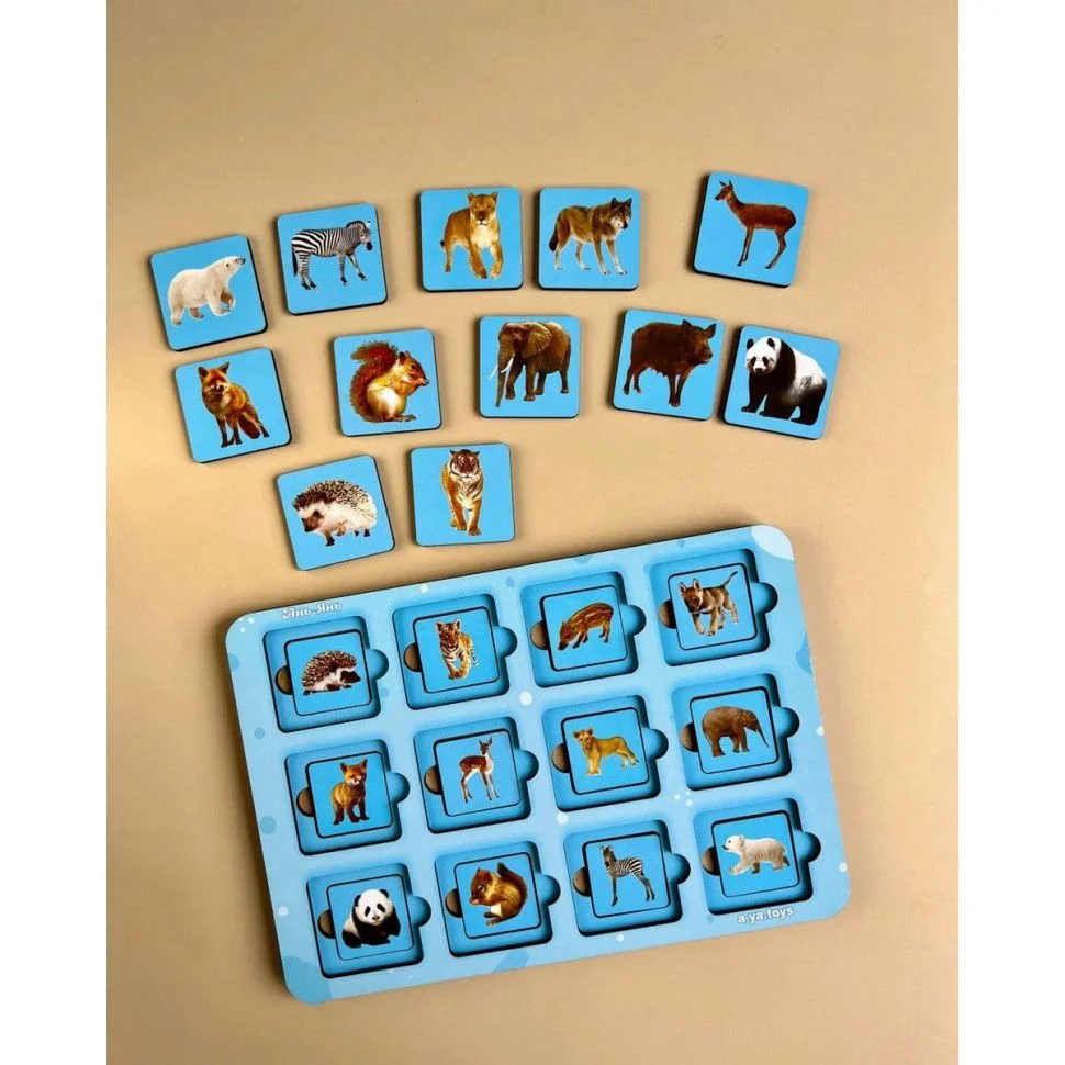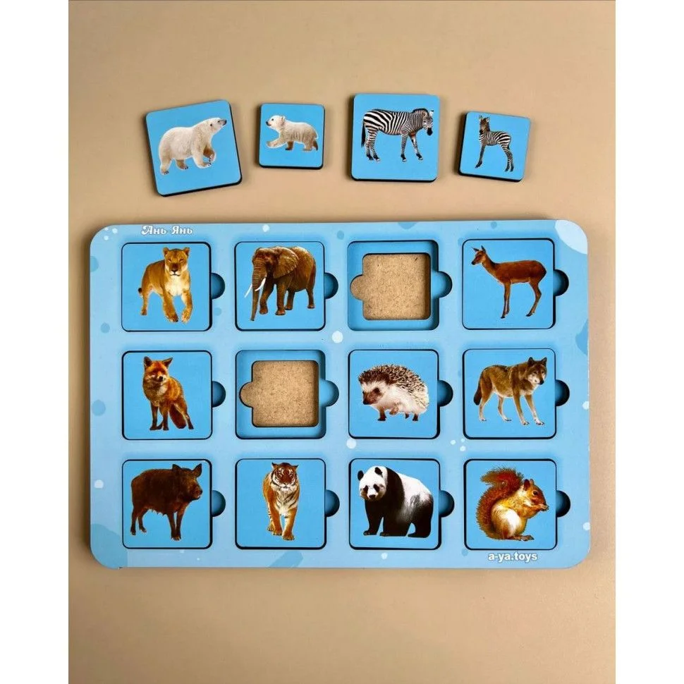 У наборі 24 плашки для гри. Вона допоможе наочно показати як реалістично виглядають дорослі тварин та їхні малюки. Розкажіть дитині, наприклад, як називають дитинча зебри, що любить їсти, де живе? Пограйте в меморі: розкладіть кілька плашок, подивіться з дитиною, що зображено. Потім переверніть плашки і попросіть дитину знайти цю тварину серед решти плашок.