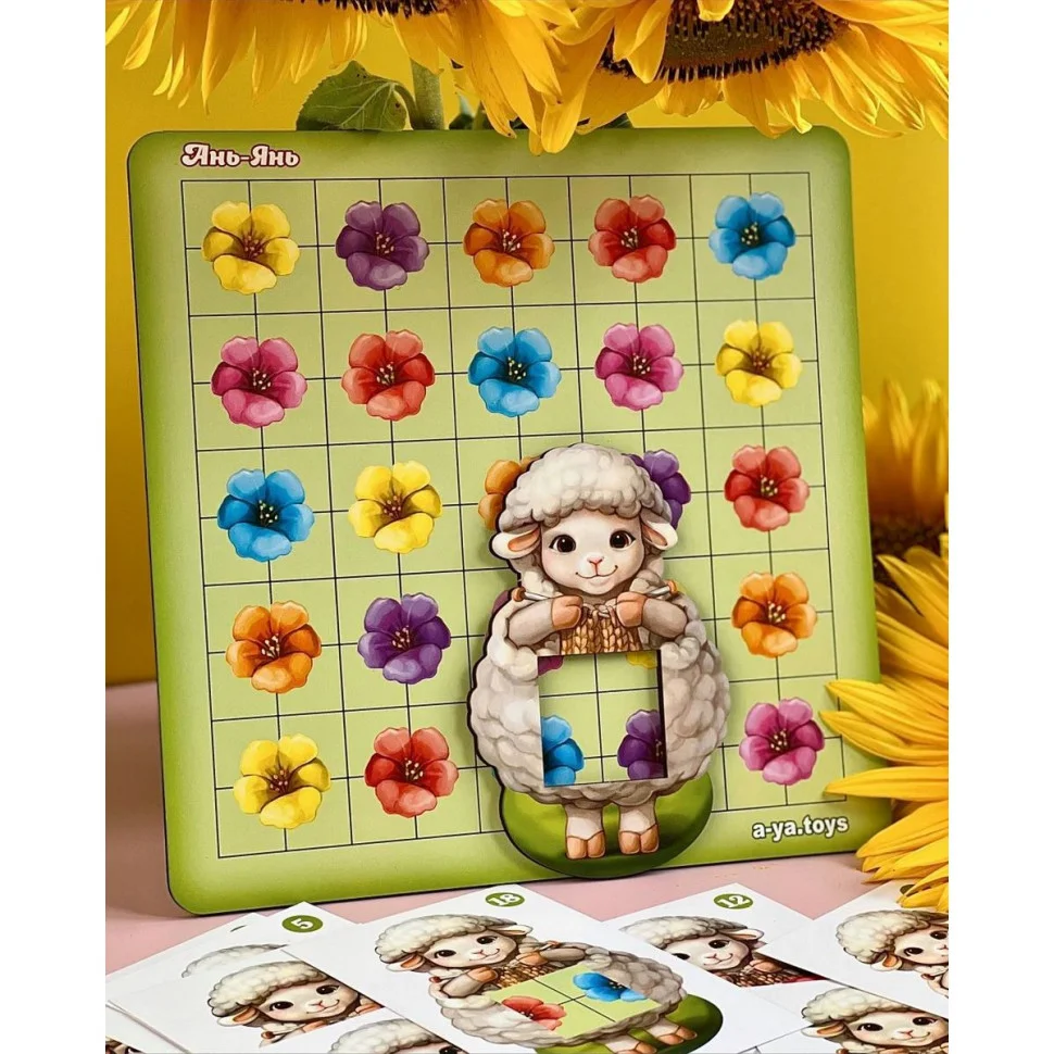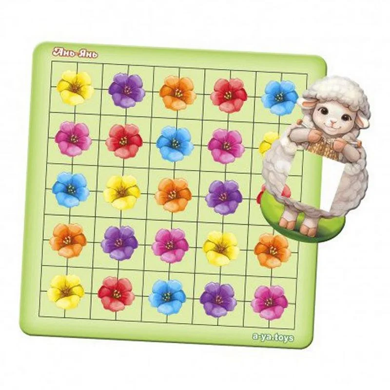 У наборі: ігрове поле, вівця та 20 карток. Завдання дитини: за допомогою вівці знайти фрагменти квіток, зазначені на картці.