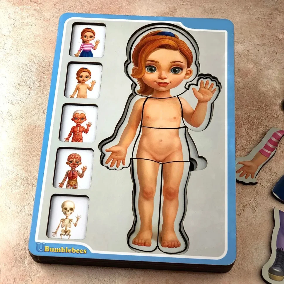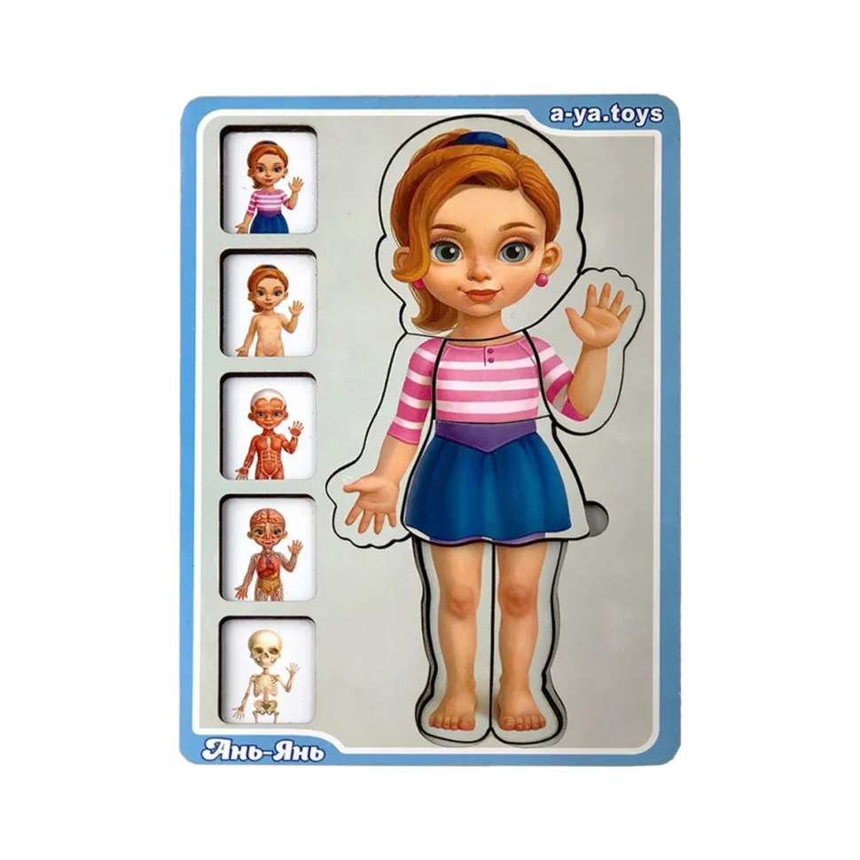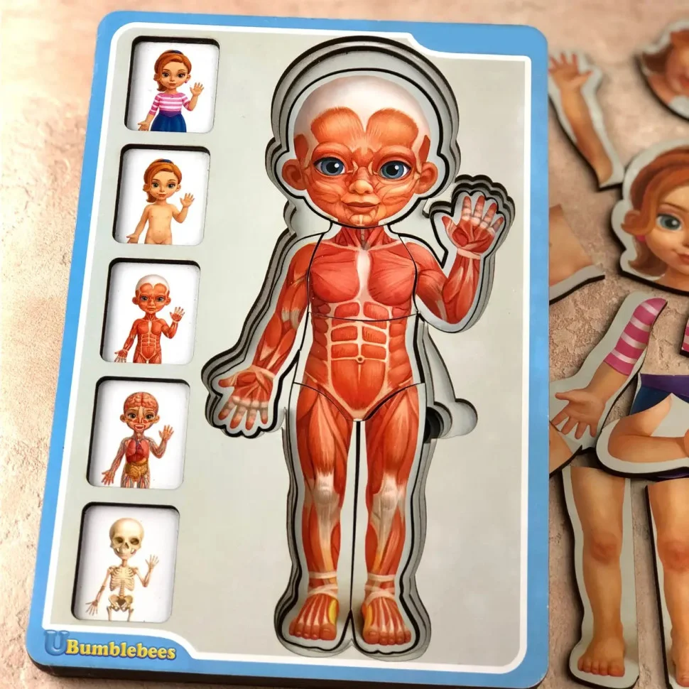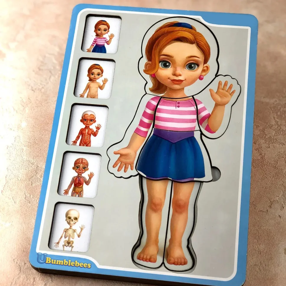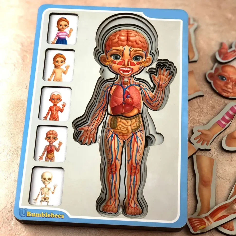 Тепер познайомити дитину з особливостями будови людського організму можна весело граючи. Наш 5-ти шаровий пазл - це цілий наочний посібник для докладного вивчення скелета, м'язової тканини, кровоносної системи, шкірного покриву і зовнішнього вигляду людини в одязі.