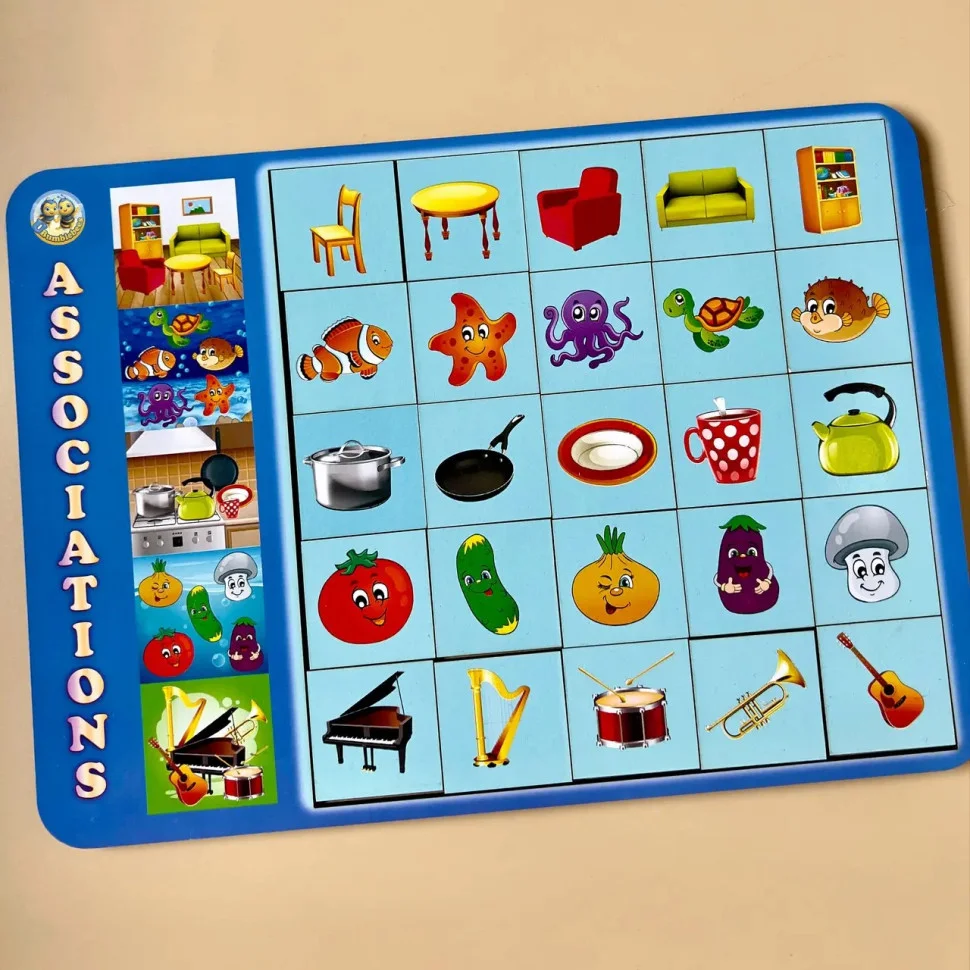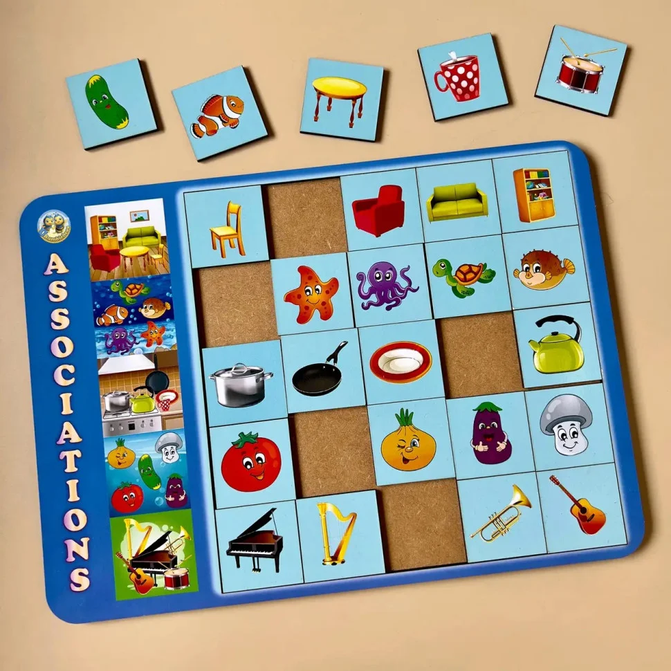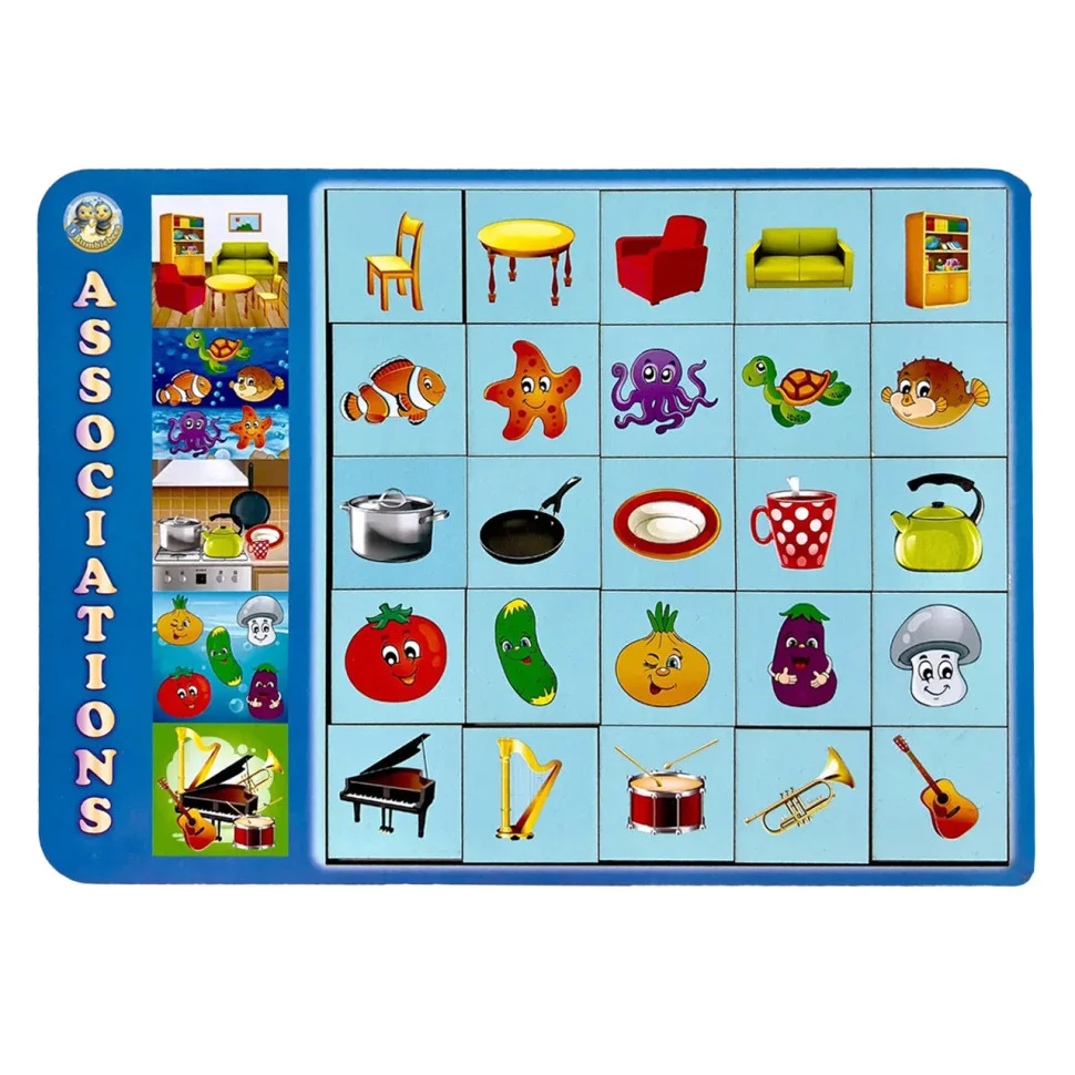 Дерев'яний планшет-рамка, на якому зображені п'ять різних картинок. Квадрати в ряд (всього 5 рядів – 25 плашок) з предметами або персонажами з картинок. Необхідно правильно зібрати 5 рядів плашок із зображенням предметів і персонажів.