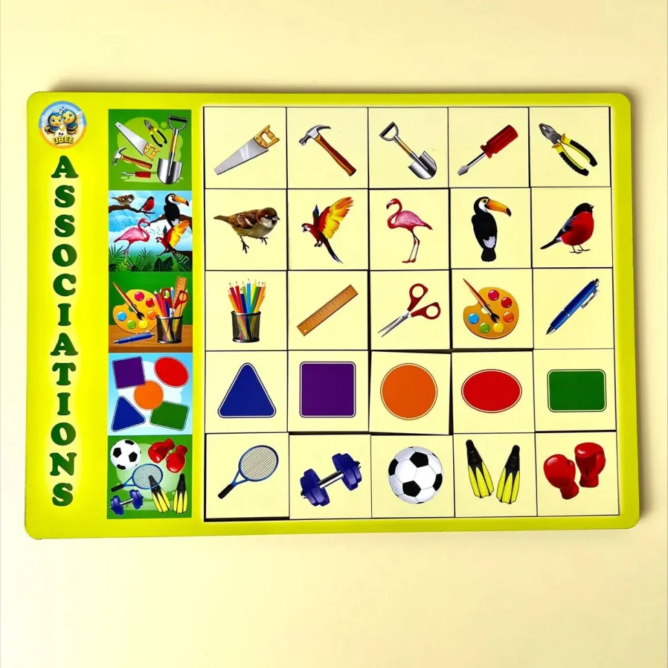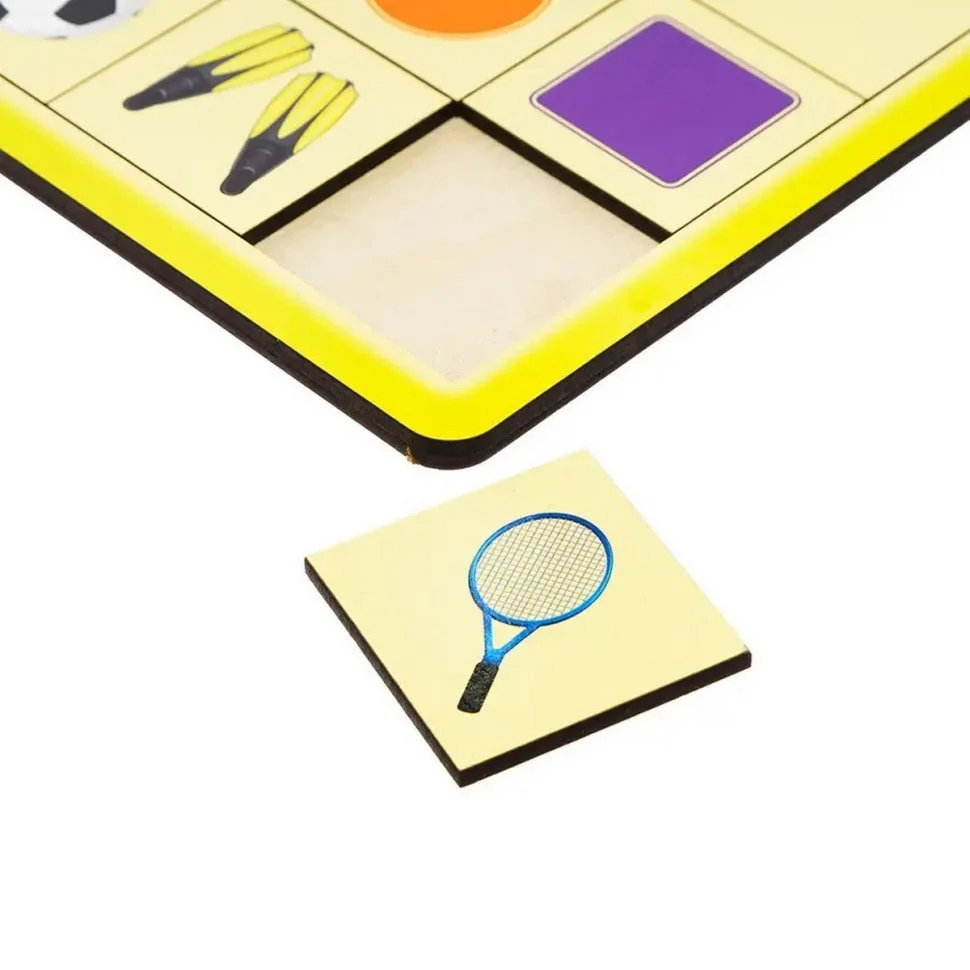 Дерев'яний планшет-рамка, на якому зображені п'ять різних картинок. Квадрати в ряд (всього 5 рядів – 25 плашок) з предметами або персонажами з картинок. Необхідно правильно зібрати 5 рядів плашок із зображенням предметів і персонажів.
