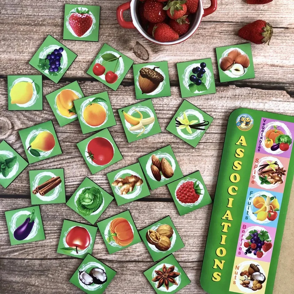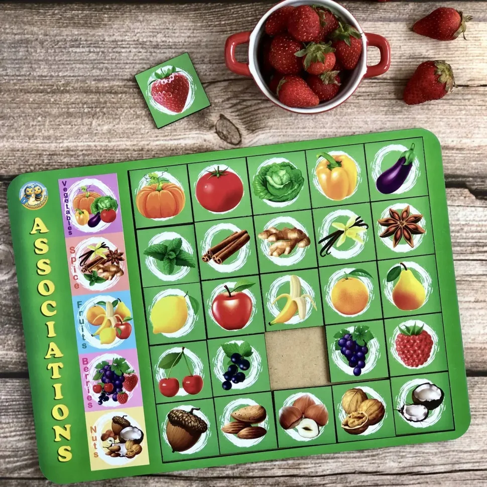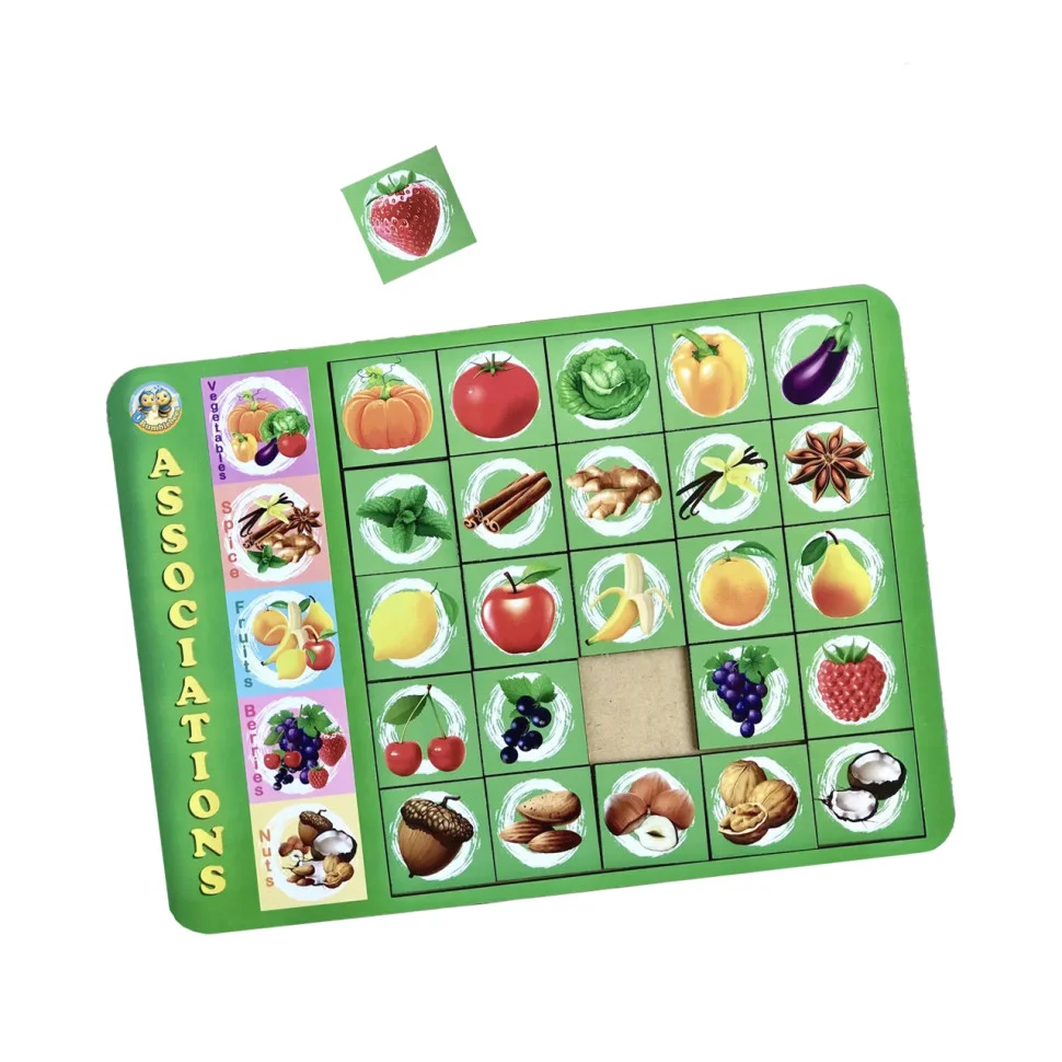 Дерев'яний планшет-рамка, на якому зображені п'ять різних картинок: спеції, ягоди, фрукти, овочі та горіхи. Квадрати в ряд (всього 5 рядів – 25 плашок) з персонажами з картинок. Необхідно правильно зібрати 5 рядів плашок відповідно до прикладу зліва.