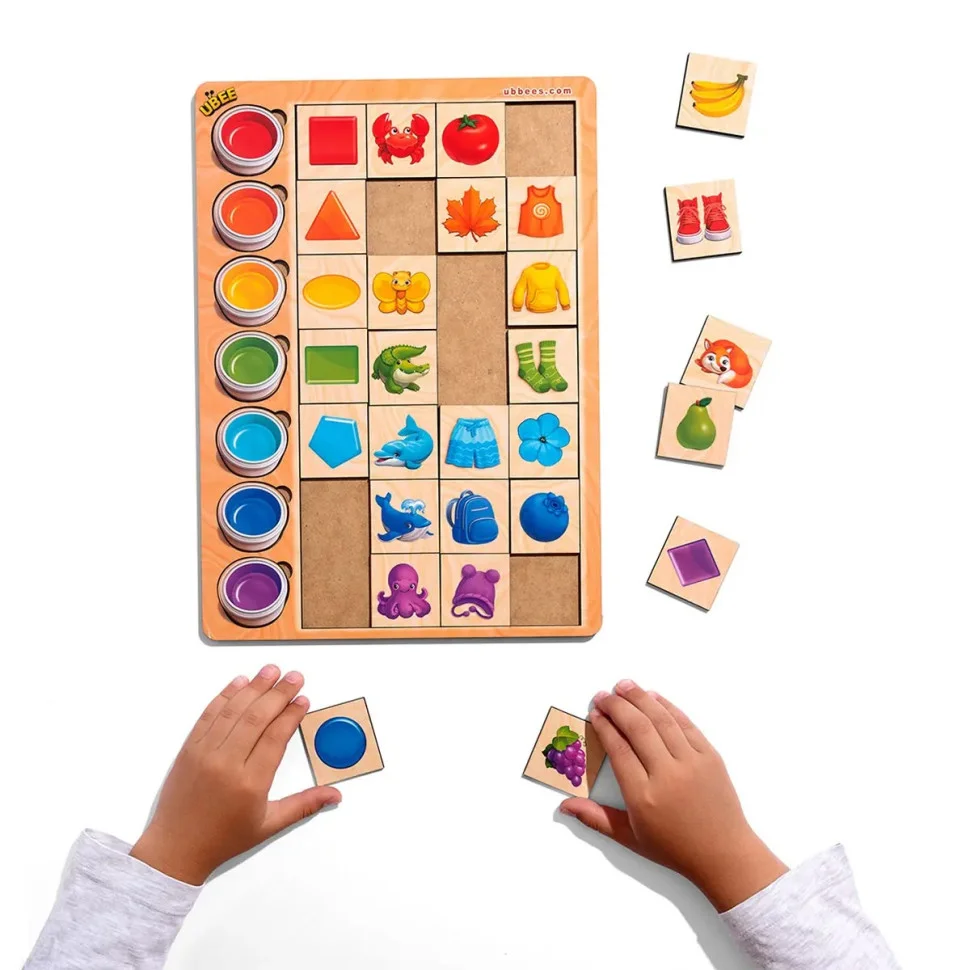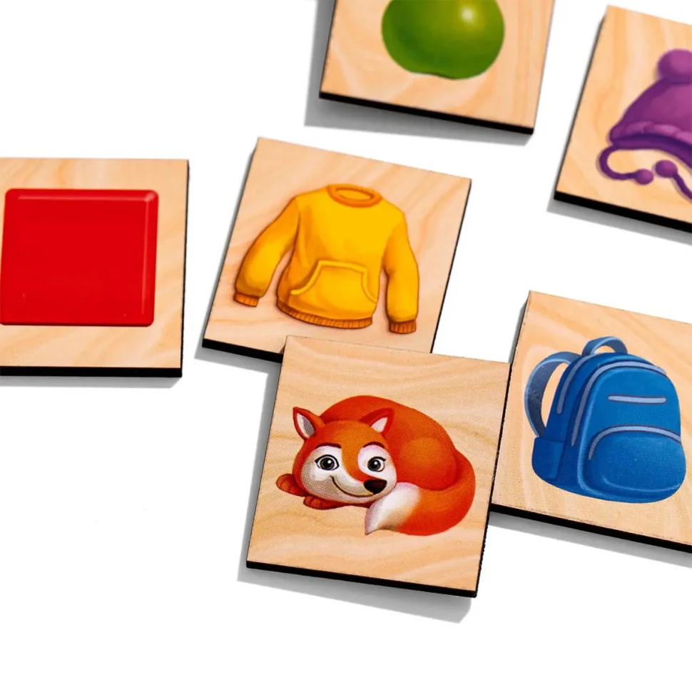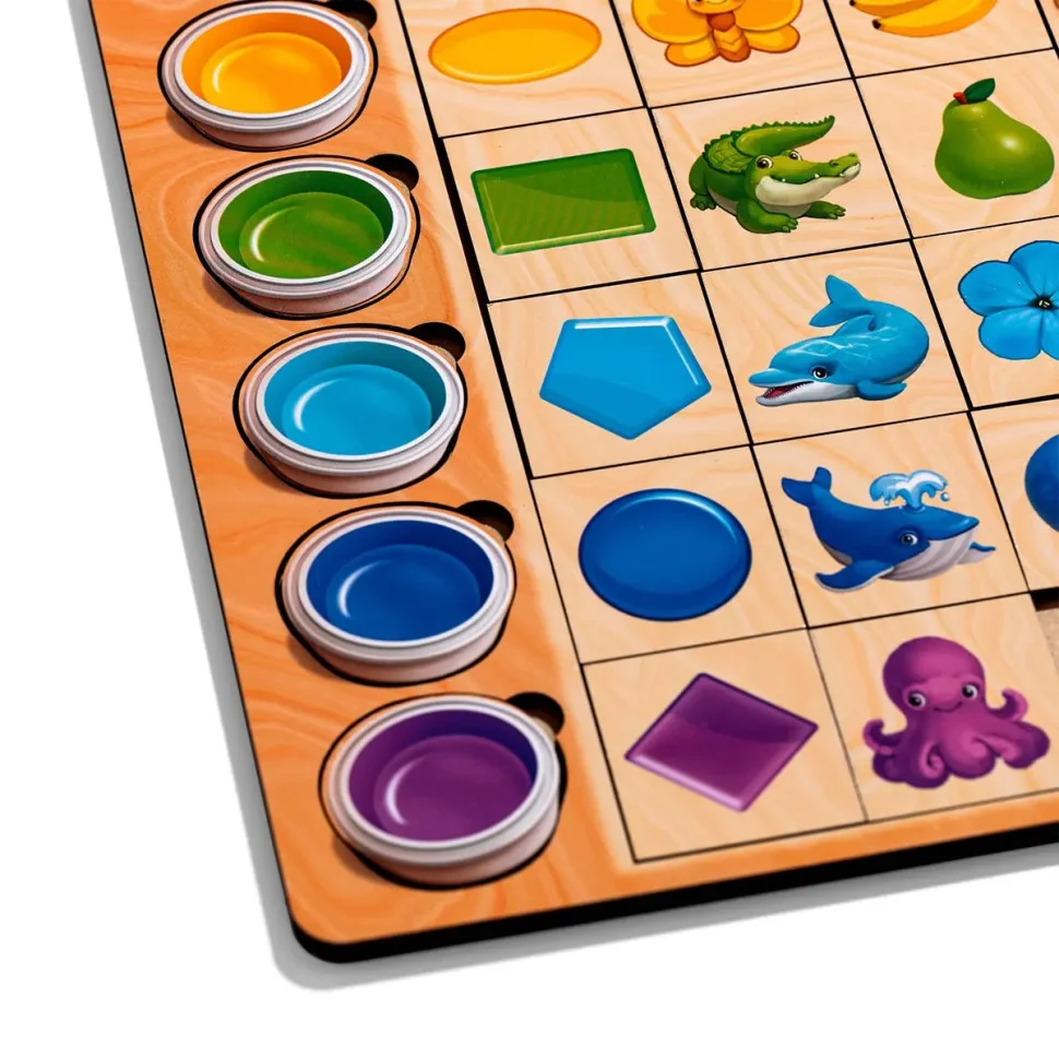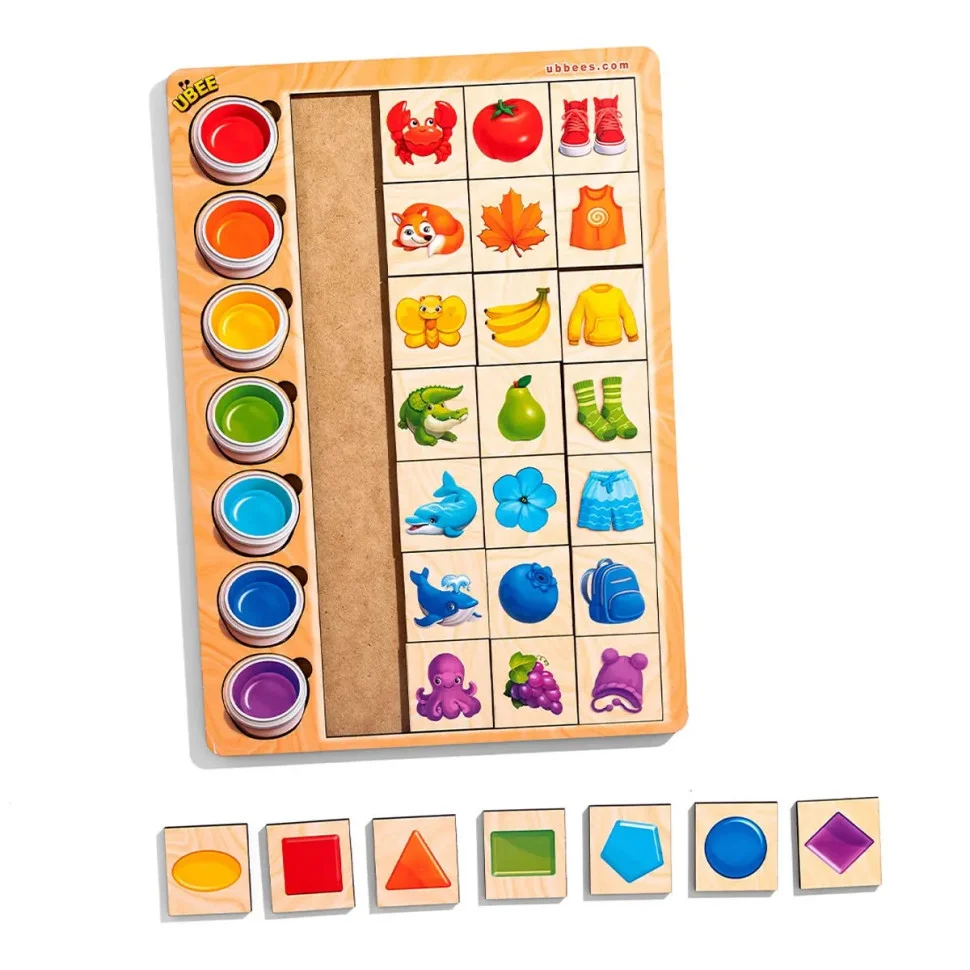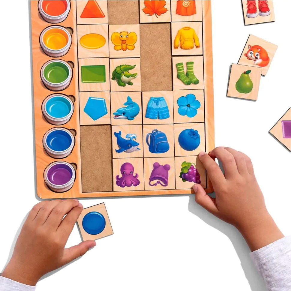 Сортер складається з планшета, на якому зображено 5 олівців різного кольору та 25 плашок із різними персонажами та предметами, які дитині необхідно підібрати під олівці за кольором. Гра добре тренує асоціативне мислення у дітей. Плашки можна рахувати і грати ними в "Меморі" та "5-й зайвий".