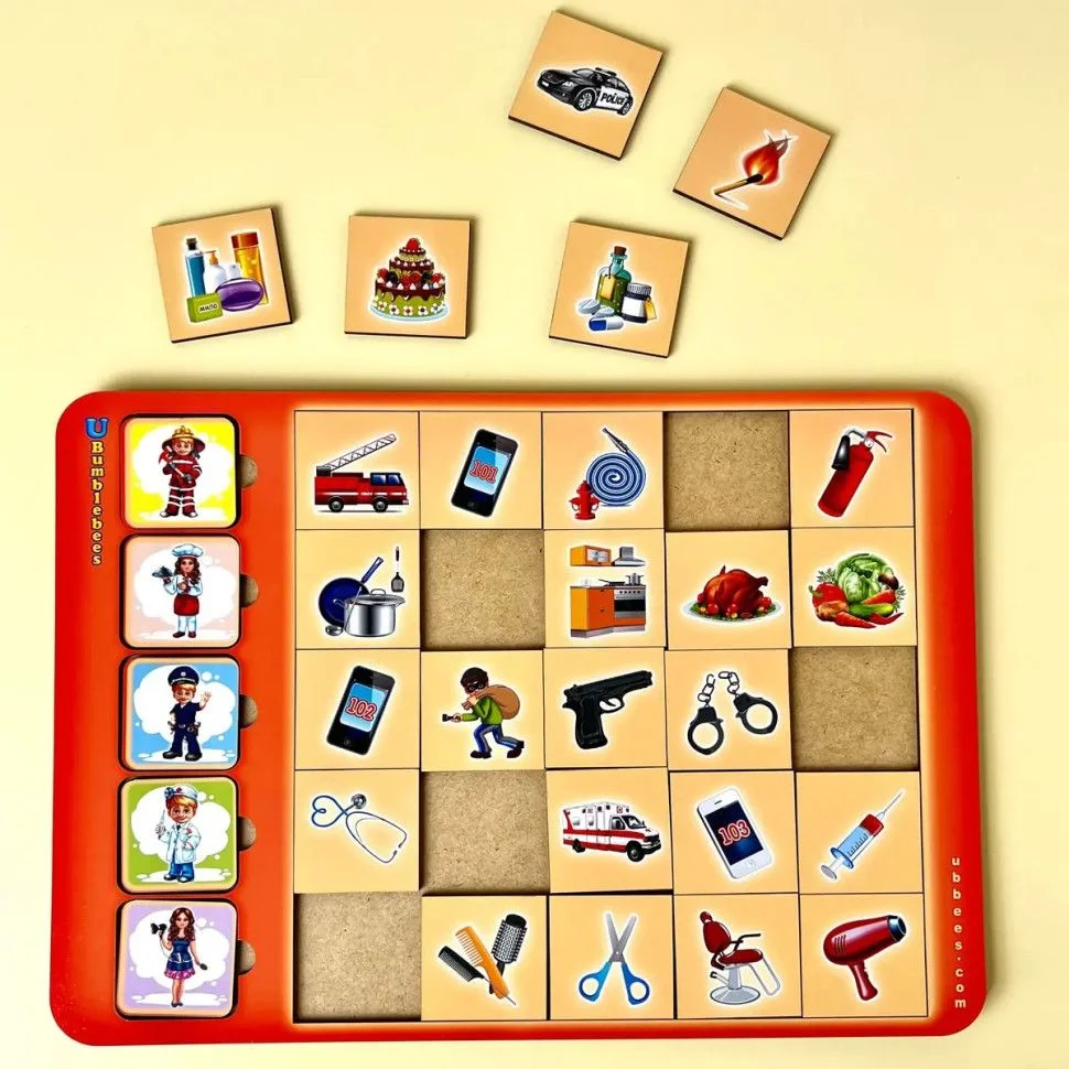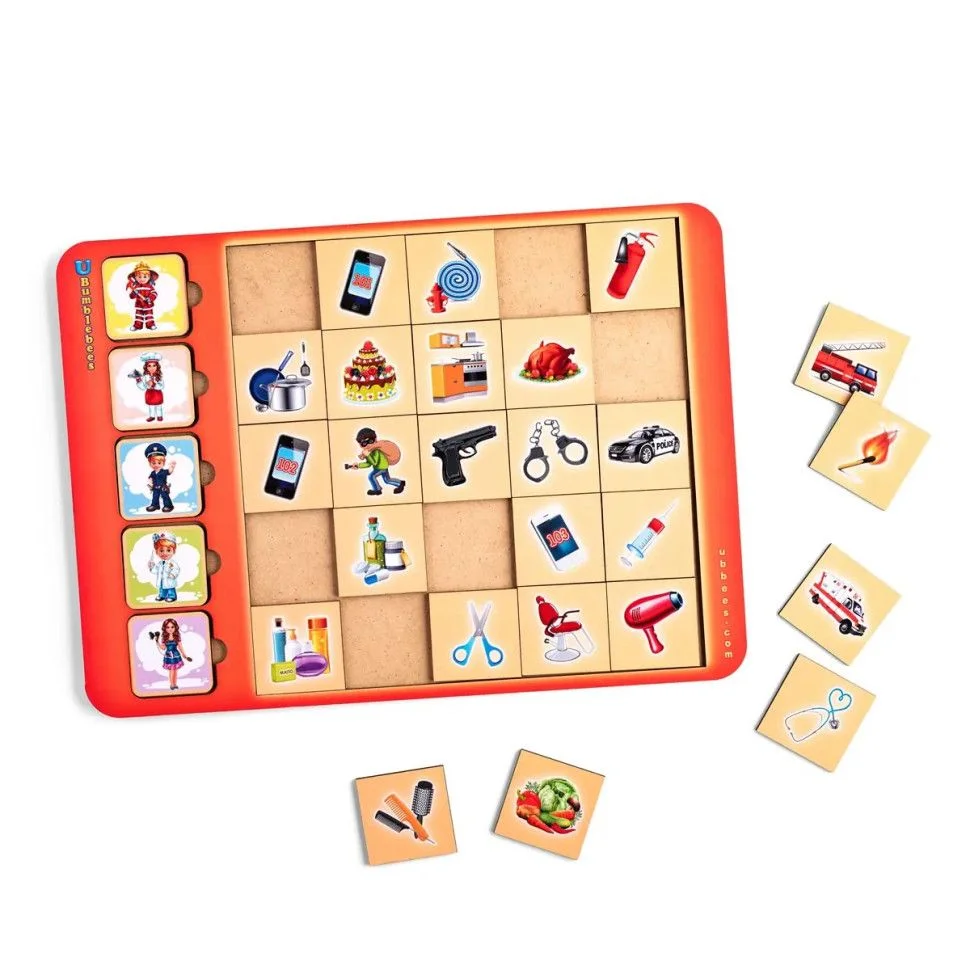 Сортер складається з планшета з 5 картинками представників різних професій та 25 плашок з тематичними предметами, які малюкові потрібно підібрати під кожну професію. Гра добре тренує асоціативне мислення у дітей. Плашки зручно рахувати та грати ними у "Меморі" або "5-й зайвий".
