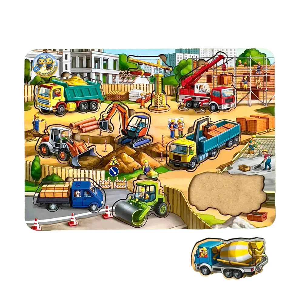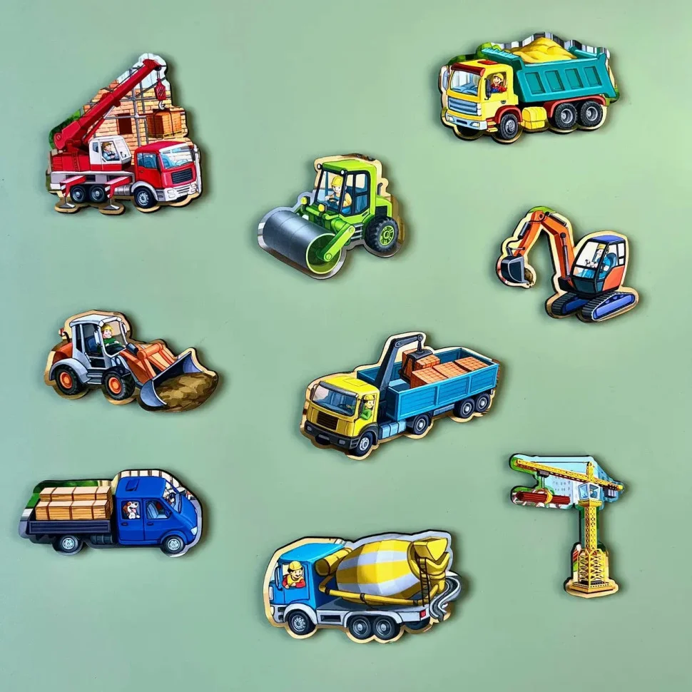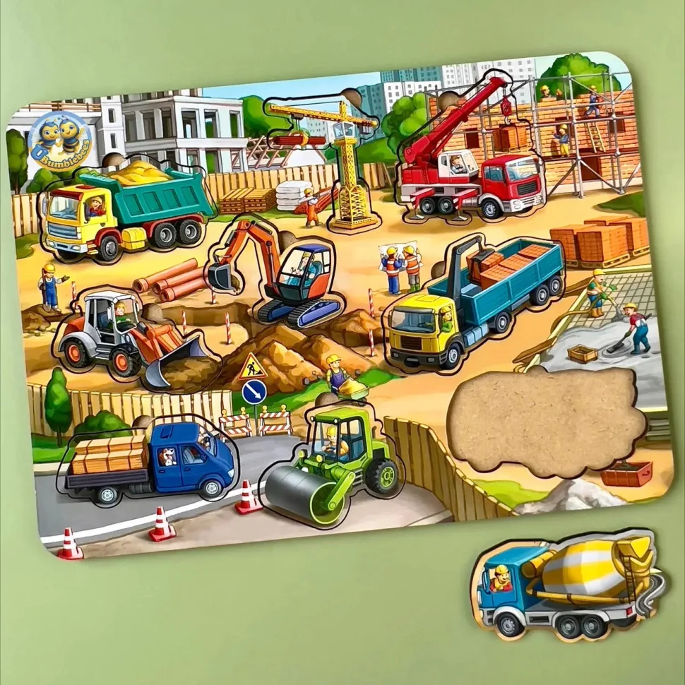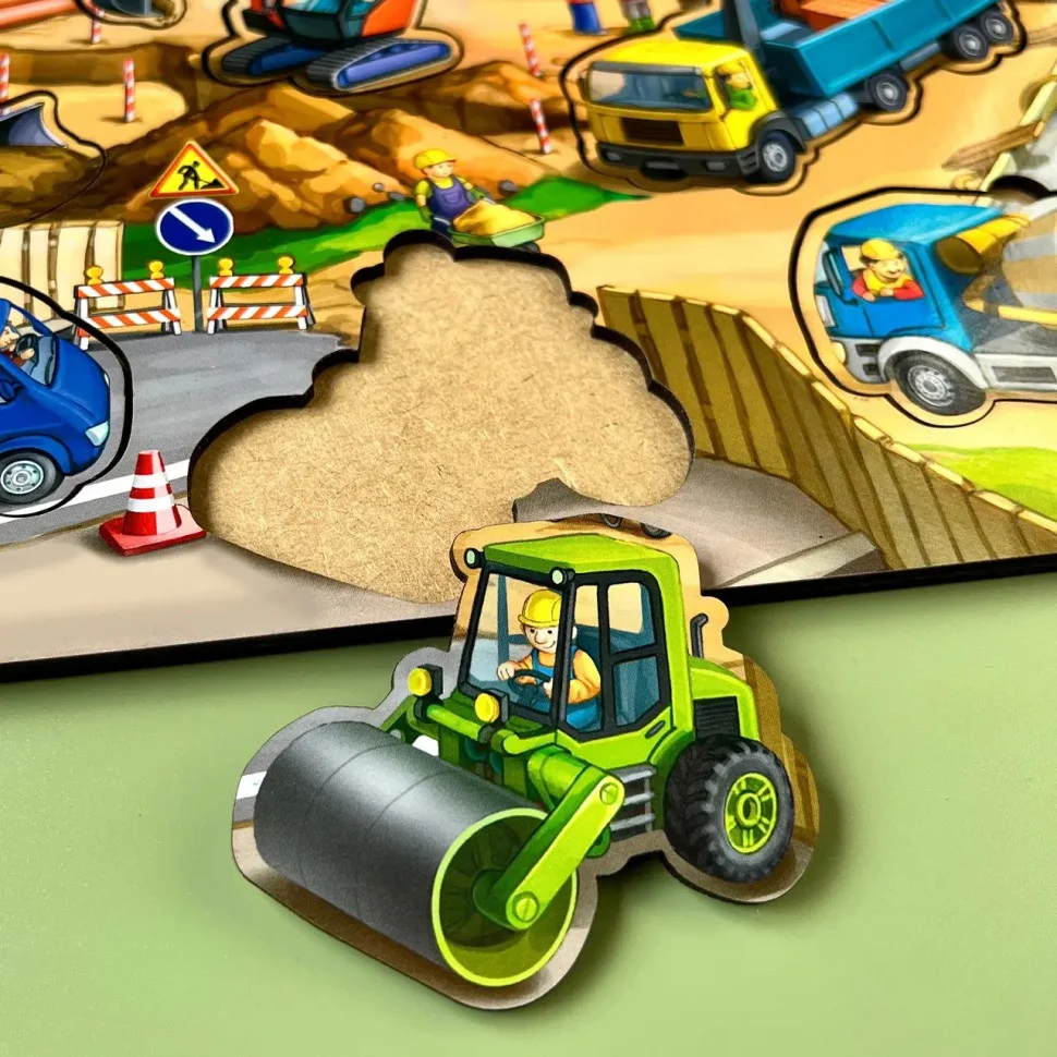 У цьому великому сортері вся будівельна техніка - це вкладиші, які зручно діставати пальчиками з основи. Фон - це сам будівельний майданчик з технікою, будівельниками і матеріалами. Дітям буде цікаво розглядати кожен елемент малюнка.