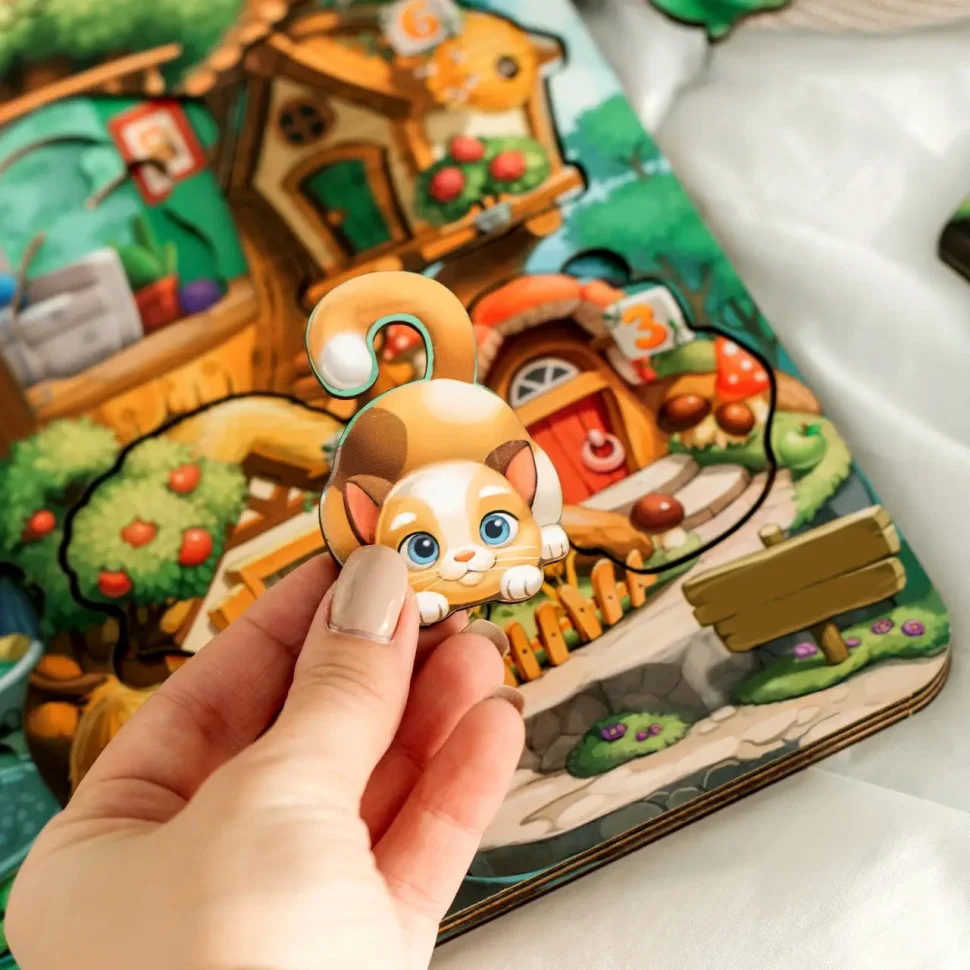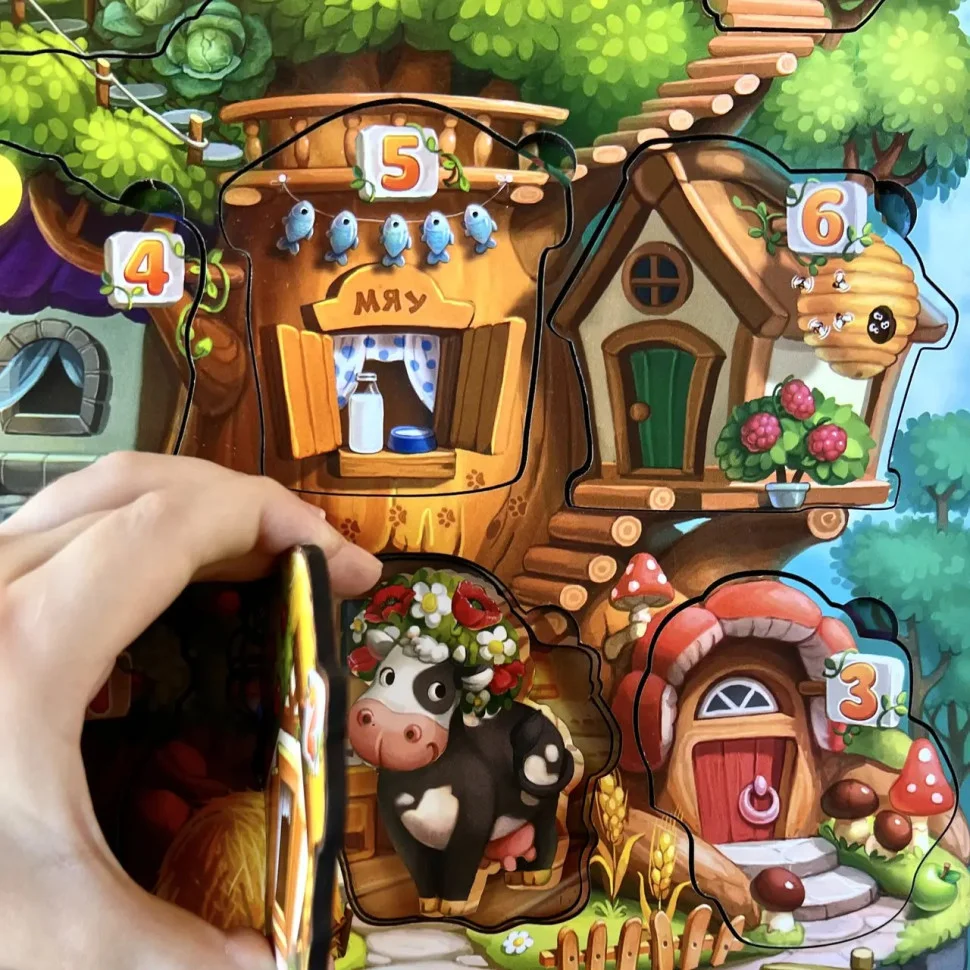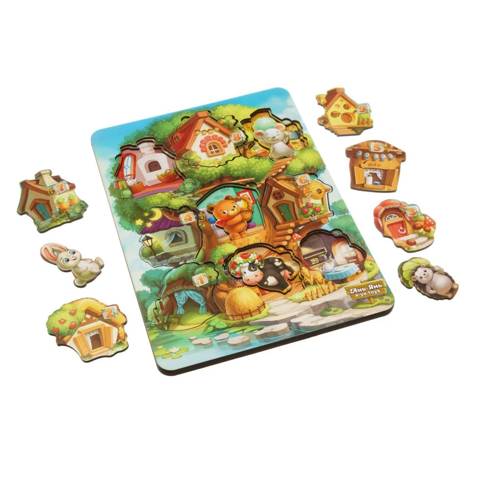 Тришаровий вкладиш у вигляді дерева, на якому живуть 9 тварин і у кожного свій тематичний будиночок з номером 1-9. Зручно діставати пальчиками. Всі будиночки з індивідуальним інтер'єром – це як підказка для дитини, щоб вона знайшла будиночки для всіх звірів. Наприклад, будиночок мишки – у вигляді сиру і т. д.