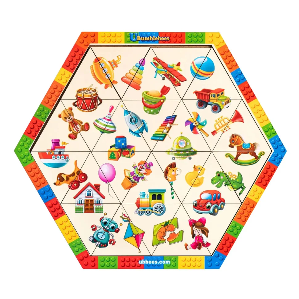 Цей яскравий шестикутний пазл вчить дитину бачити зв’язки між частиною і цілим, розвиває логічне мислення та зорове сприйняття. Складаючи трикутні деталі, малюк утворює знайомі іграшки та тренується в уважності та просторовому мисленні.