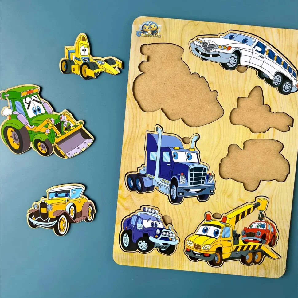 У наборі 7 різних машинок-вкладишів і кожній потрібно знайти своє місце. Грайте і вивчайте з дитиною види транспорту, розкажіть, які з них перевозять людей, а які – вантажі, вивчайте поняття "великий" і "маленький". Машинки зручно діставати пальчиком.