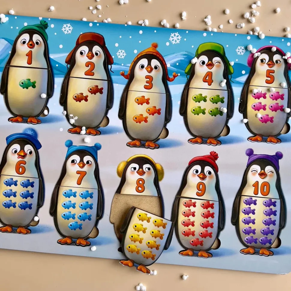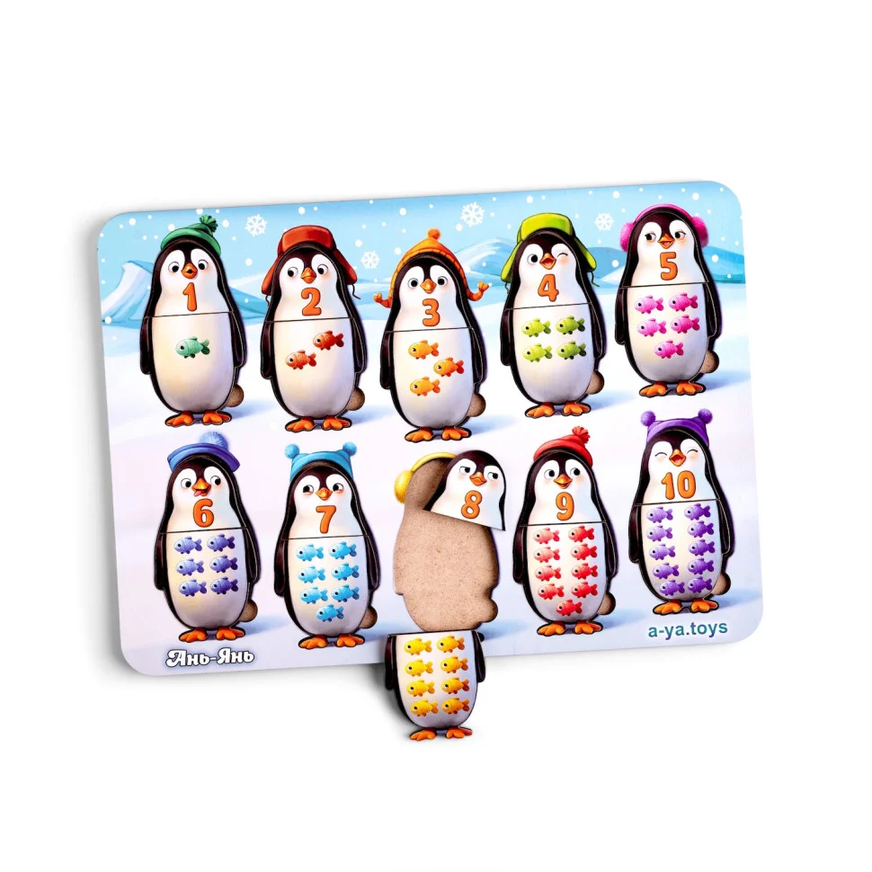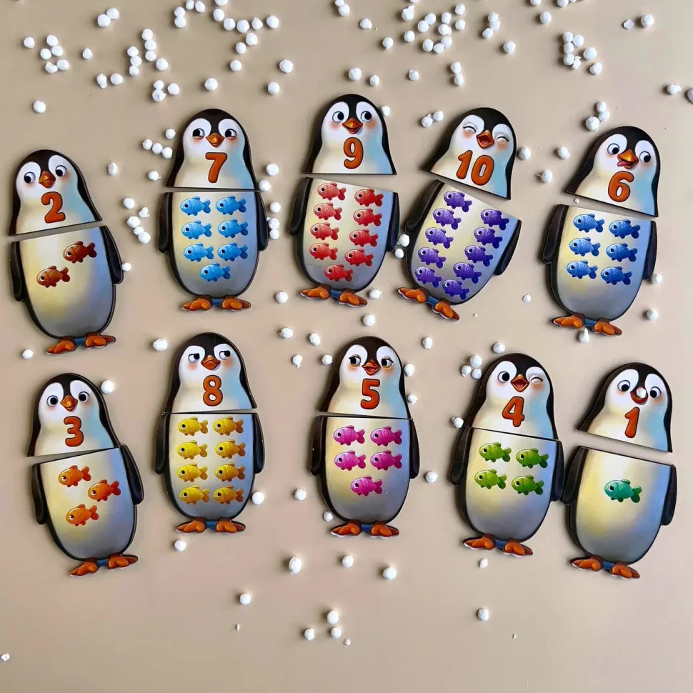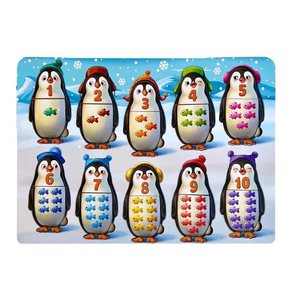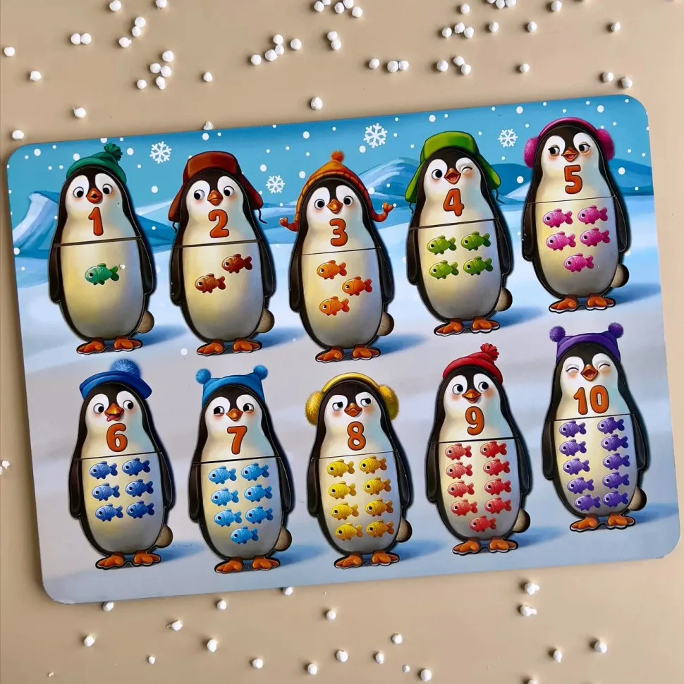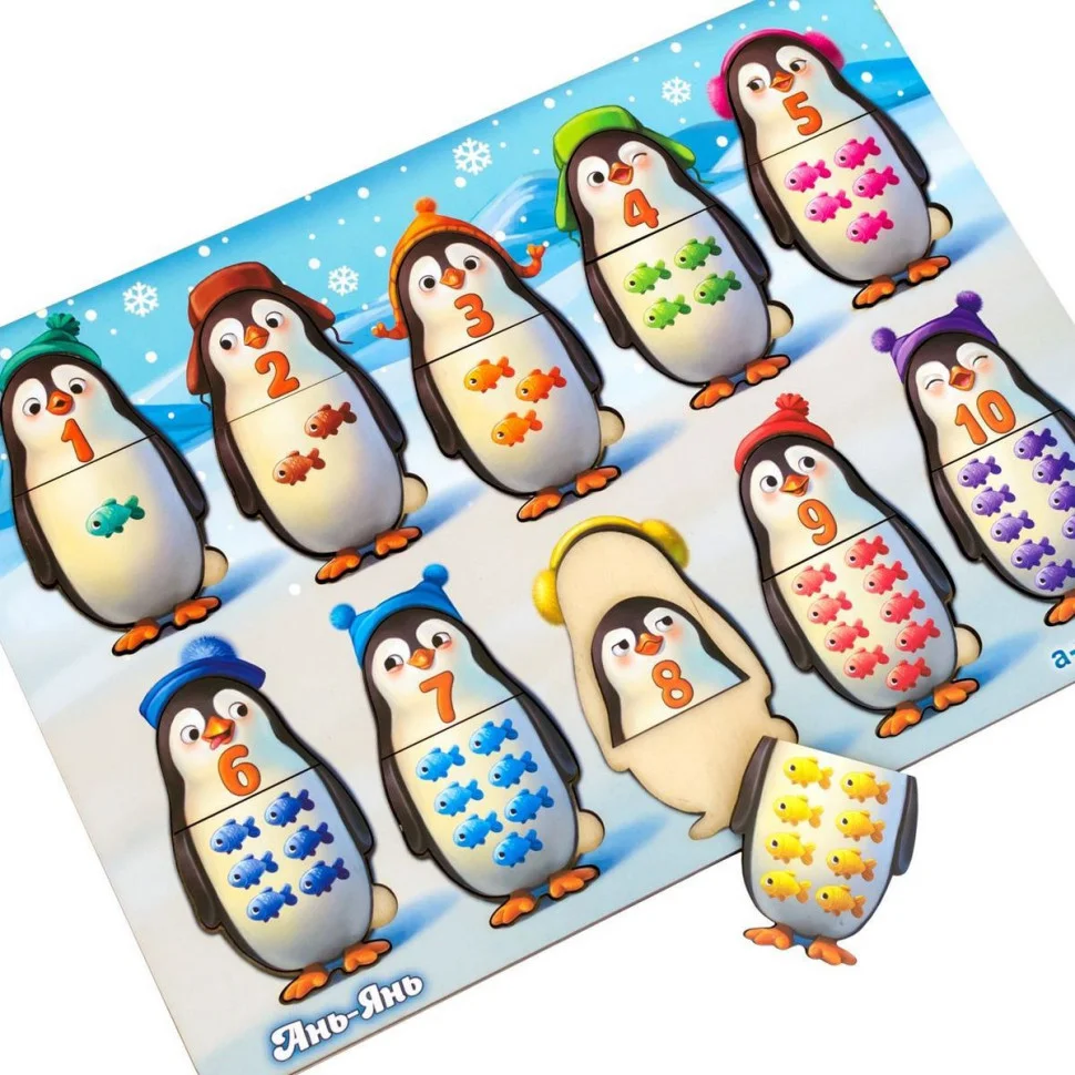 10 вкладишів-пінгвінів, які розділені навпіл (обидві частини виймаються). На одній частині намальована цифра, а на інший рибки 1-10 штук. Щоб правильно зібрати пингвинчика, потрібно порахувати рибок і знайти це число. Також підбирати рибок можна за кольором шапочки (це для малюків). Відмінна гра для зрозумілого вивчення рахунку.