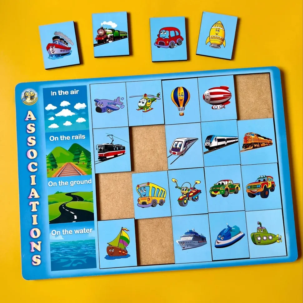 Дерев'яний планшет-рамка, на якому зображені 4 різні картинки, які вказують на види транспорту. Квадрати в ряд (всього 4 ряди – 20 квадратних плашок) з різними видами транспорту. Необхідно правильно відсортувати і зібрати всі 4 ряди плашок із зображенням різного транспорту.