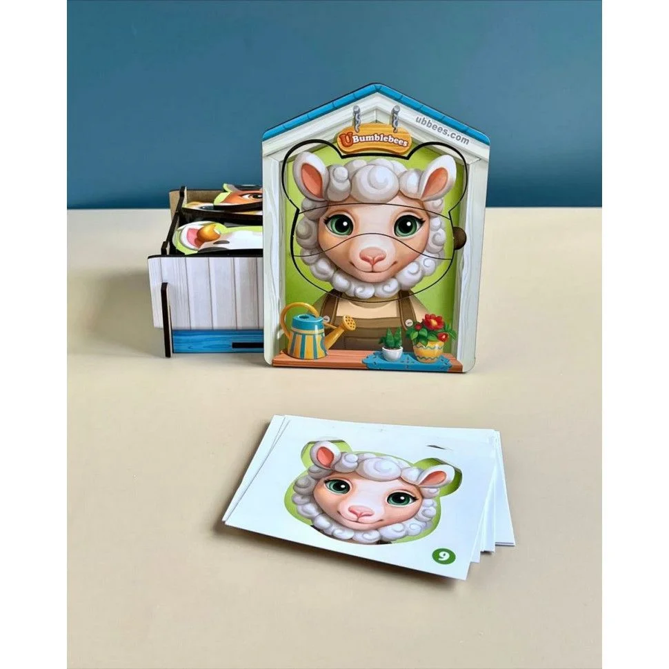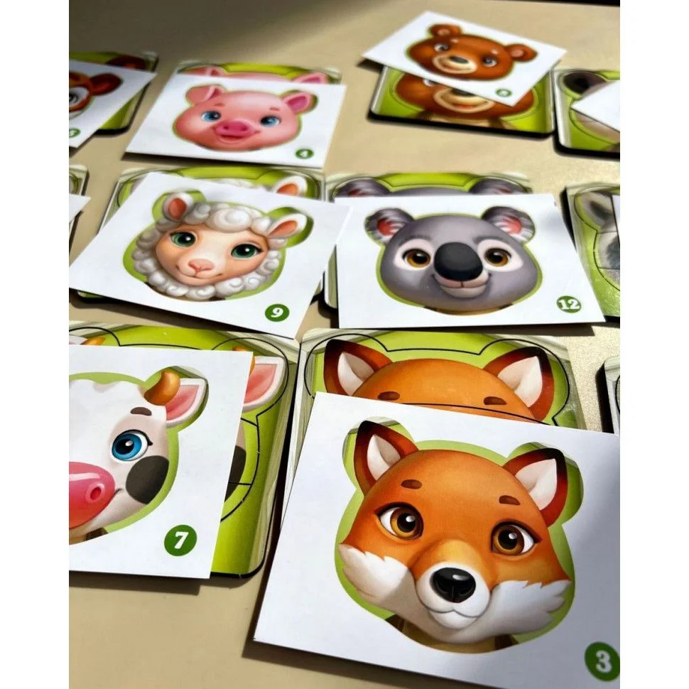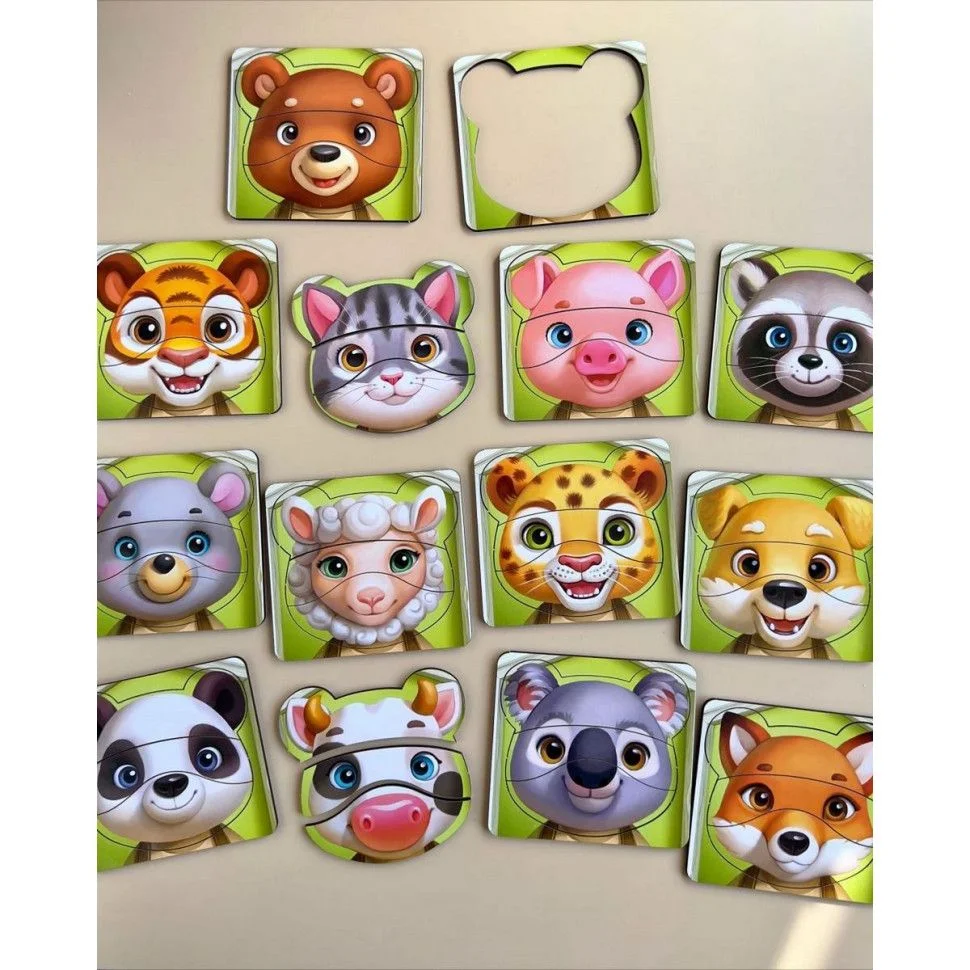 У наборi 39 деталей та 13 карток з тваринами. Завдання малюка: зiбрати тварин, як на малюнку. А ще можна створювати власних тваринок: додати котику вуха тигра або ротик собачки.