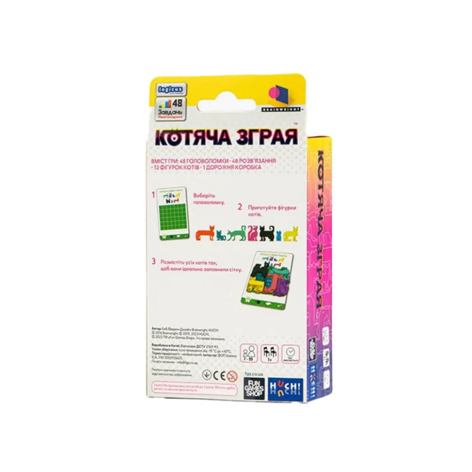 Коротко про правила: Виберіть картку завдання та покладіть її на рівну поверхню. Приготуйте фігурки котів, зазначені у верхній частині карти. Розмістіть цих котів так, щоб вони закривали всі клітини сітки і при цьому жодна частина кота не закривала простір за межами сітки.