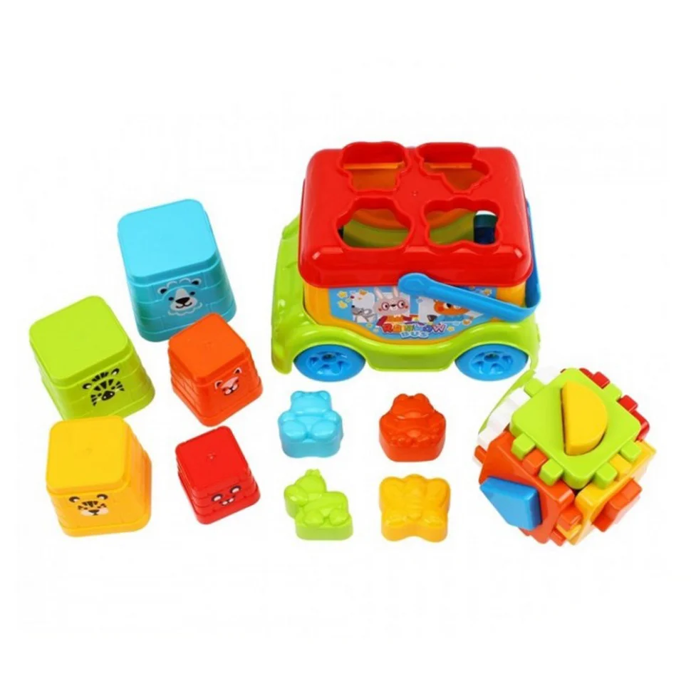 - Автобус із кришкою для сортування фігурок тваринок — зручно й цікаво розміщувати фігурки у спеціальні відсіки, тренуючи навички точності та координації рухів.