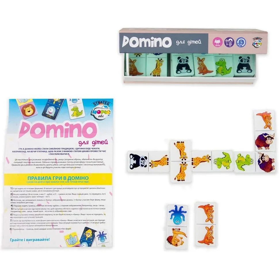 Domino Strateg - це доміно для маленьких гравців. Складається з набору яскравих доміношок. Доміношки виготовлені з оргскла - легкого і міцного матеріалу. Елементи схожі на скельця, при цьому вони не б'ються.