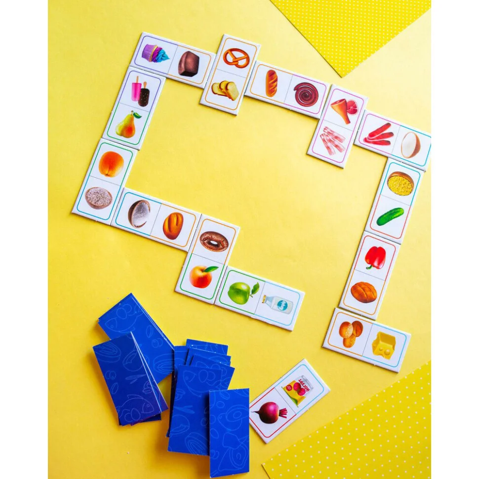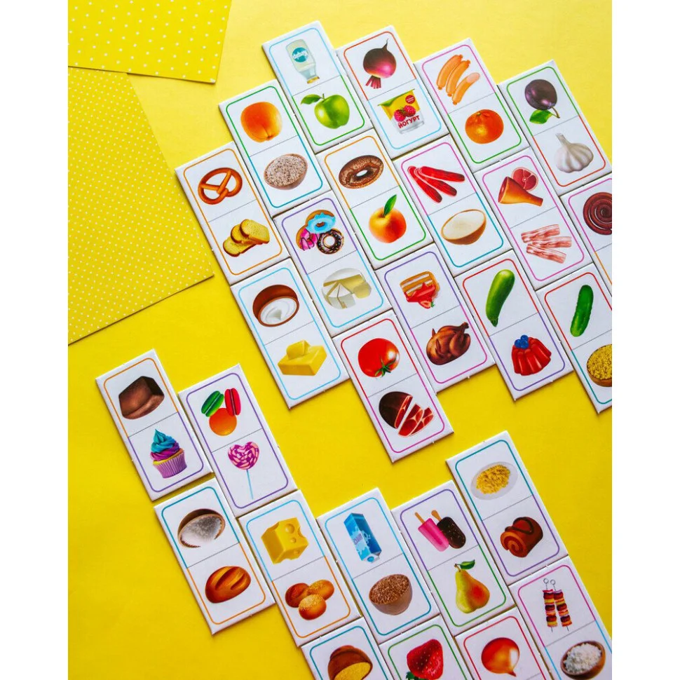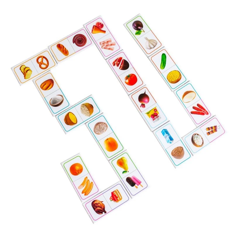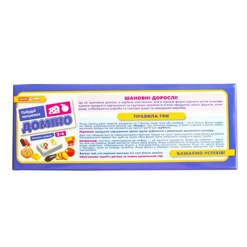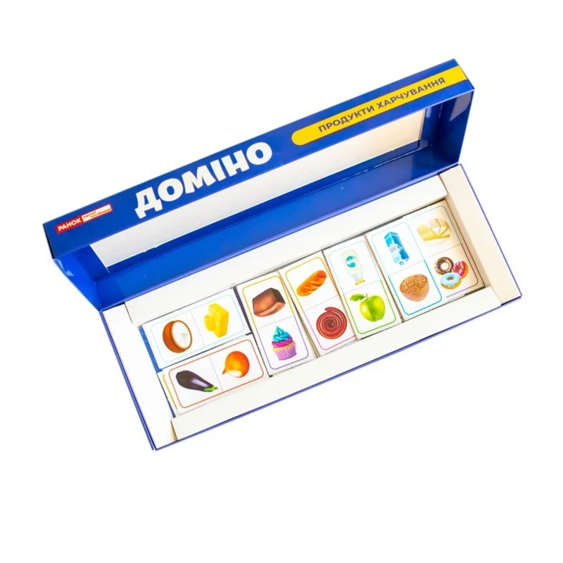 Доміно "Продукти харчування" - навчально-розвивальна гра для дітей віком від 4 років. У набір входить 28 міцних карток із яскравими зображеннями та простими правилами гри, що надруковані на упаковці. Кількість гравців: 2-4.