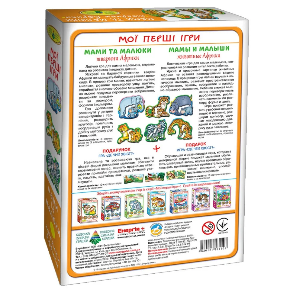 Захоплююча дитяча настільна гра Мами і малюки. "Африканські тварини" 81107 - логічна гра, призначена для самих маленьких з колекції «Мої перші ігри». Гра, спрямована на розвиток інтелекту Вашої дитини, буде актуальна як для дитячого саду, так і для домашнього проведення часу. Надзвичайно соковиті, барвисті картинки тварин Африки не залишать байдужим Вашого малюка, викличуть море позитивних емоцій. В процесі гри Ваш непосида буде вчитися логічно мислити, розвине просторову уяву, пам'ять, сприйняття і наочно-образне мислення. Комбінуючи деталі гри між собою, знаходячи правильні відповіді і рішення, Ваш малюк поліпшить координацію рухів і дрібну моторику рук і пальчиків. Гра Мами і малюки української торгової марки Енергія Плюс представлена українською мовою, і відрізняється бездоганною якістю виготовлення із застосуванням екологічно чистих матеріалів і безпечних барвників без неприємних запахів.