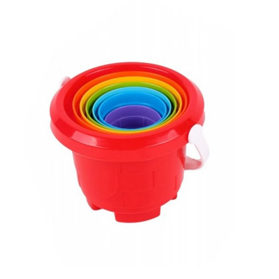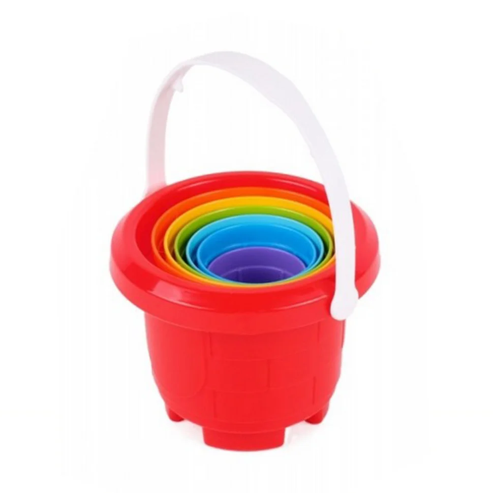 Яскрава пірамідка в кольорах веселки. Особливістю іграшки є те, що всі формочки можна зібрати в кругле відерце з ручкою. Таку іграшку зручно переносити, брати з собою на прогулянку, в пісочницю або дитячий садок.