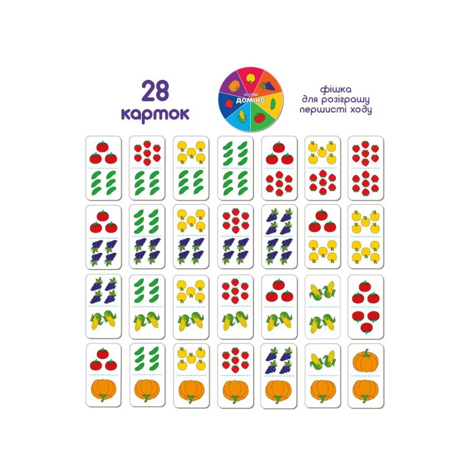 Разом із Доміно Фрукти-овочі дитина вивчить назви фруктів та овочів, з легкістю навчиться розрізняти їх за кольором, удосконалить навички лічби від 1 до 7 та весело проводитиме час у колі друзів чи батьків.