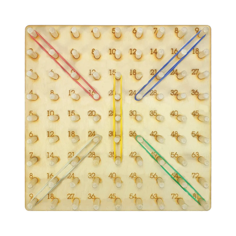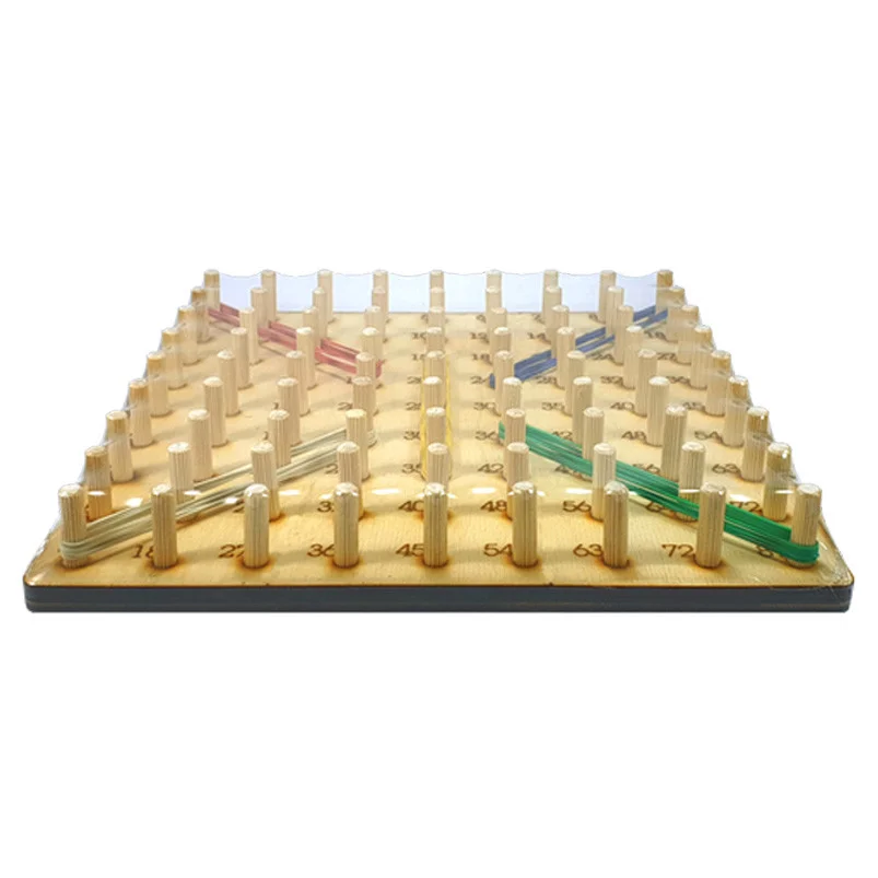 Модель оснащена 81 дерев’яною стійкою та 25 гумками, що дозволяє створювати різноманітні геометричні фігури, візерунки та моделі. Кожна стійка позначена числом відповідно до таблиці Піфагора - це допомагає дитині краще засвоювати принципи множення та закономірності чисел.